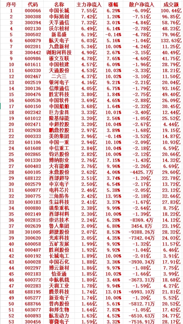 主力资金抱团特征显著,且做多意愿极强,53 只个股均获主力净流入,超半数个股主力净流入超 2 亿,头部标的如中国长城、中际旭创、天孚通信净流入均超 7 亿,大资金集中布局的趋势明确。