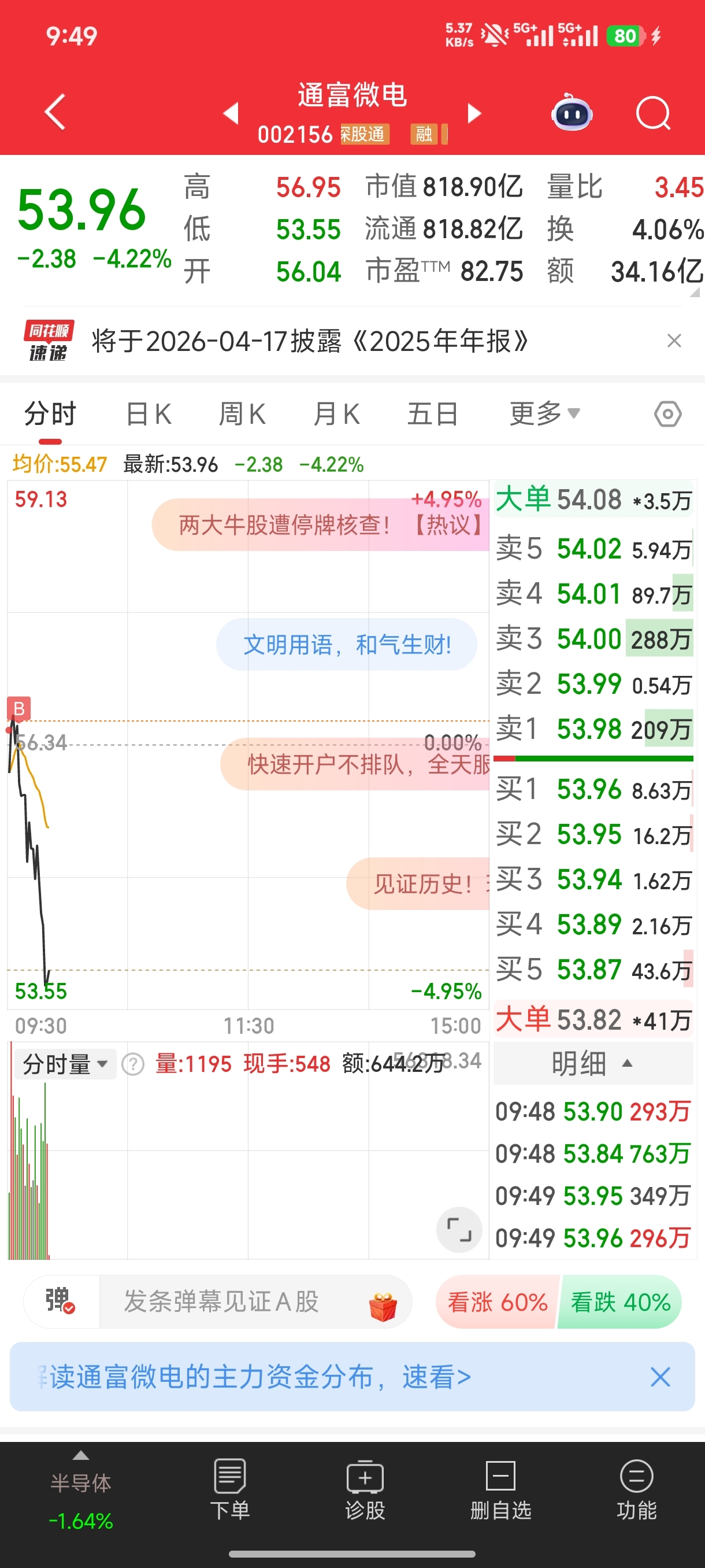 $通富微电(SZ002156)$ 有多少兄弟是早盘冲高诱进来的?