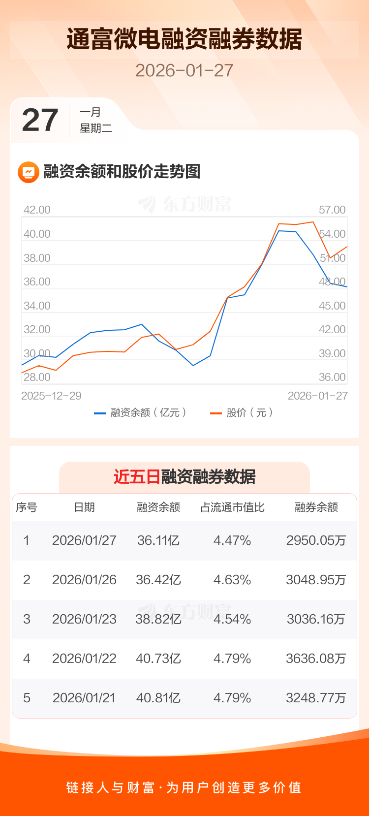 交易所最新数据显示,通富微电于2026年1月27日获融资买入9.80亿元,融资偿还10.11亿元,当日融资净偿还3123.43万元。目前,该股融资余额36.11亿,占流通市值比例为4.47%。