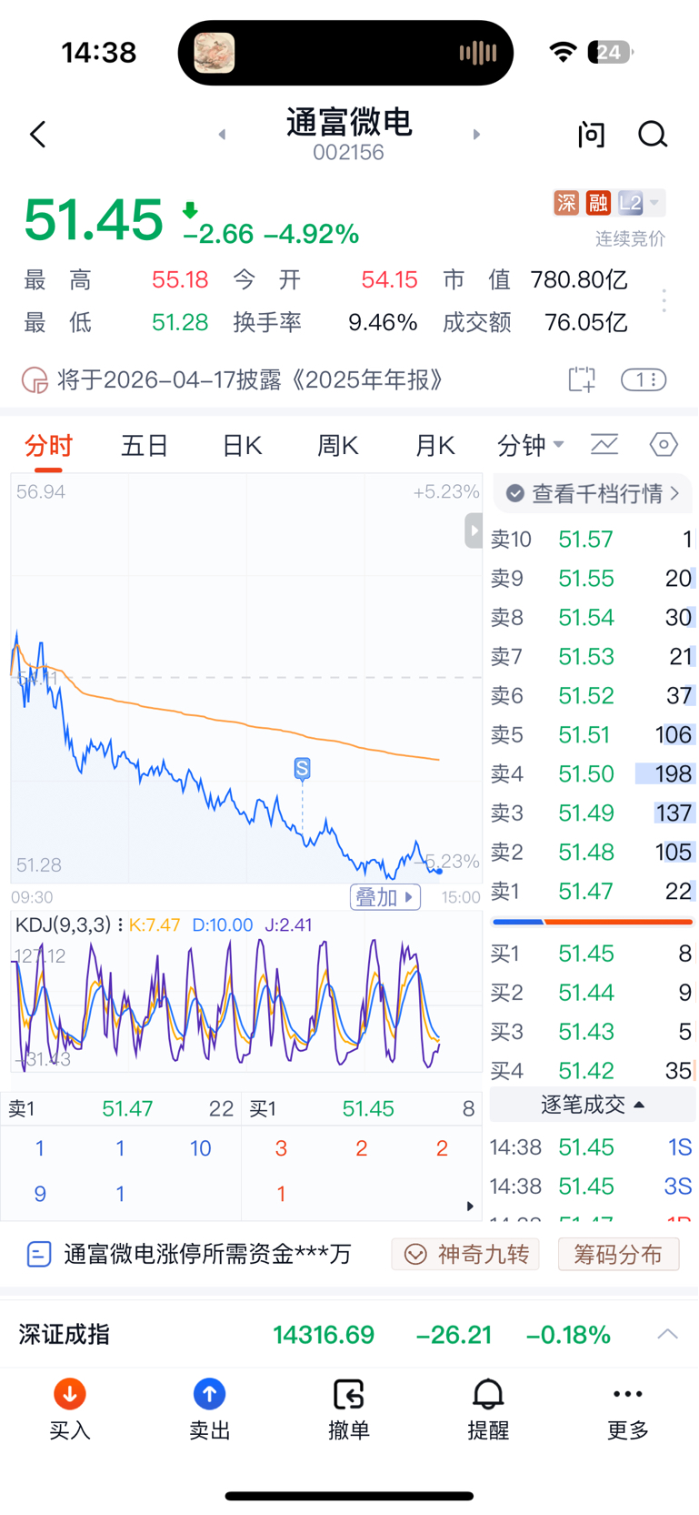 通富微电也格局不动了,几次回本都没走,今天没办法了,总共亏损了6个点,哎,也打不过