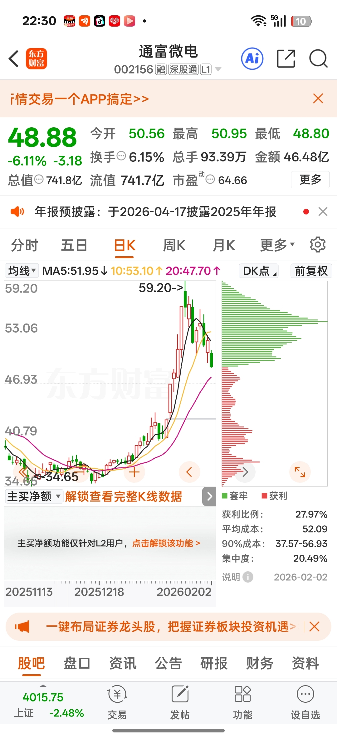 $通富微电(SZ002156)$ 今晚美股半导体大涨,明天但愿能修复,今天这走势真的有点难看。目前距离20线没有多少距离了,首先今天的半导体确实都很崩溃,明天不知道是惯性下跌还是修复,惯性等严重偏离5线加仓做一个反弹出了,如有修复看板块力度,也得T一把。龙回头可能性有吗?反正我炒股没有怎么遇到过,先降低成本吧…
