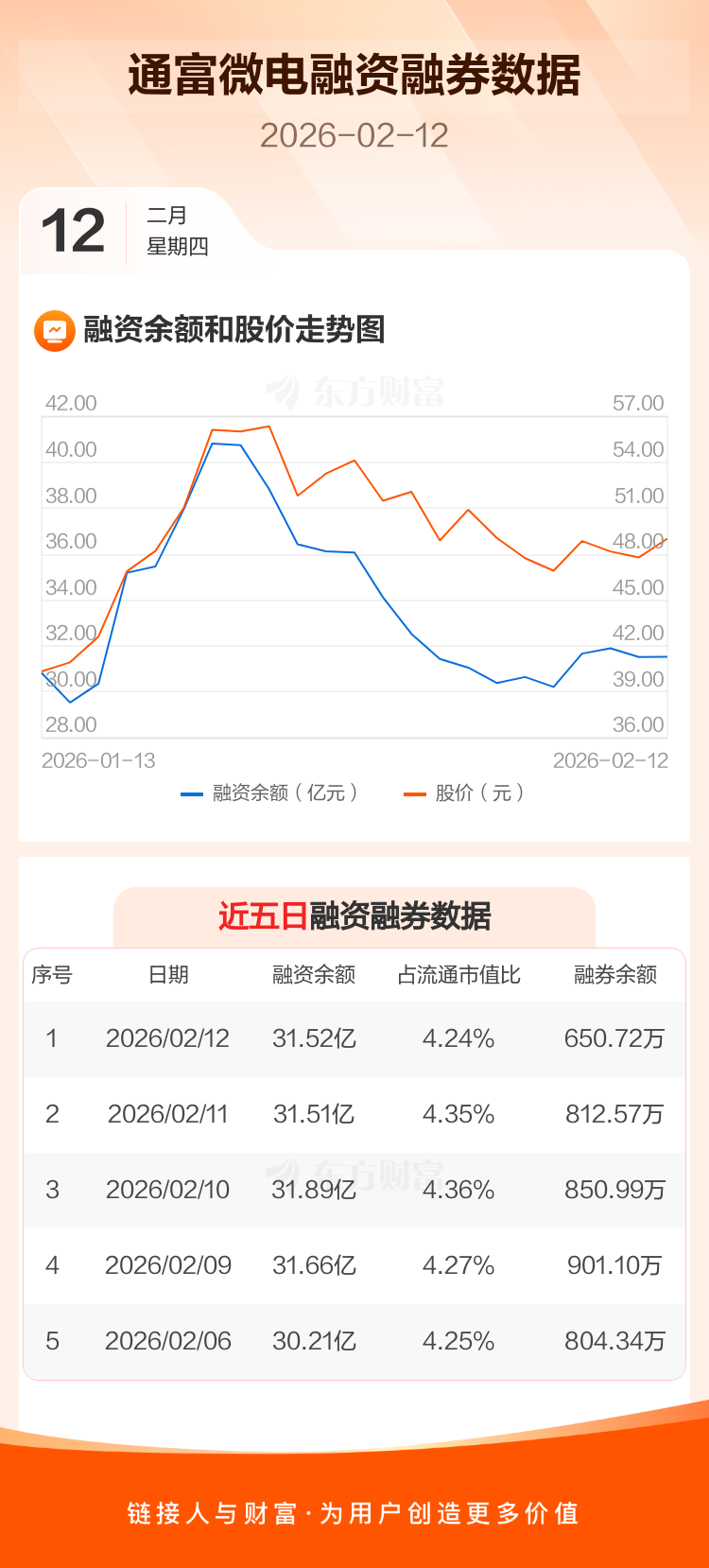 交易所最新数据显示,通富微电于2026年2月12日获融资买入3.84亿元,融资偿还3.83亿元,当日融资净买入89.62万元。目前,该股融资余额31.52亿,占流通市值比例为4.24%。