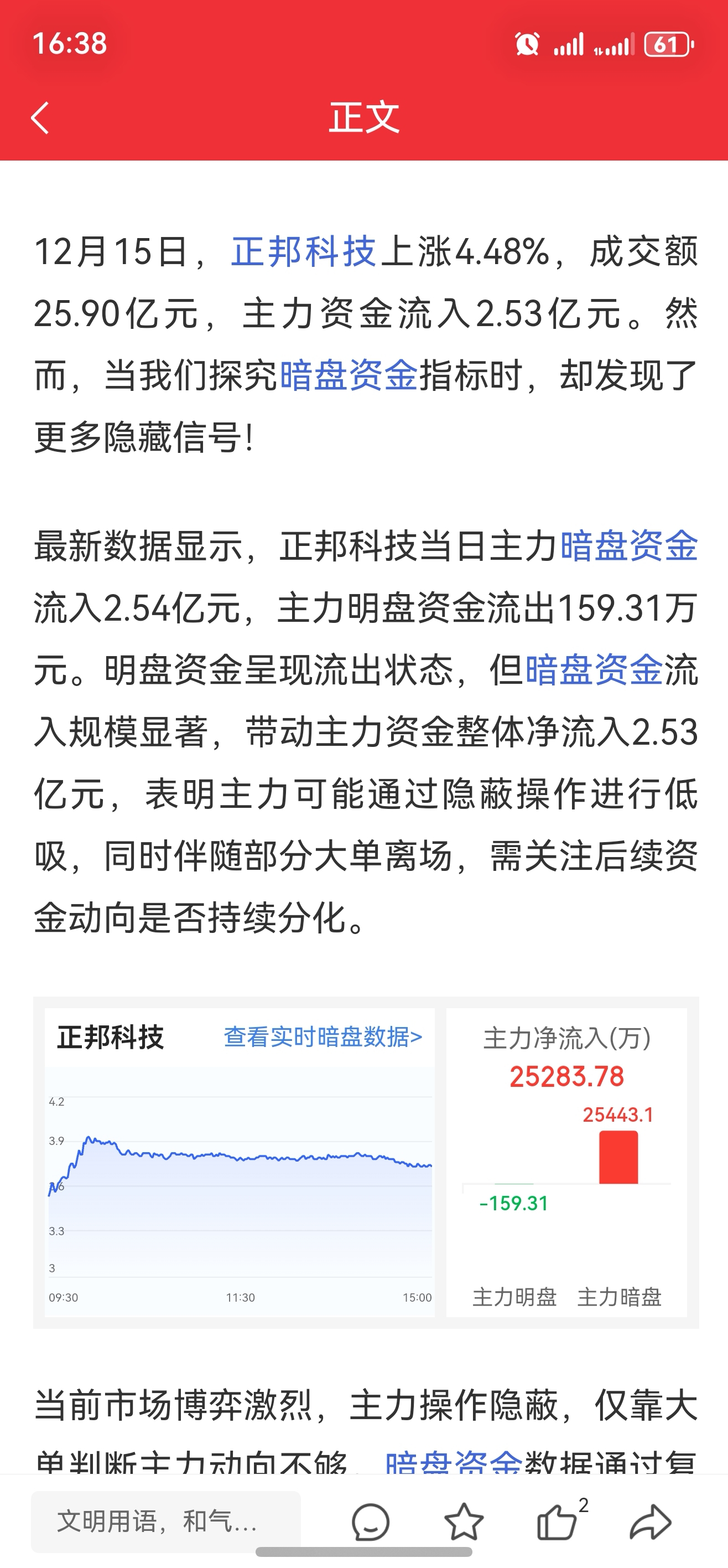 $正邦科技(SZ002157)$ 暗盘资金流入两个亿