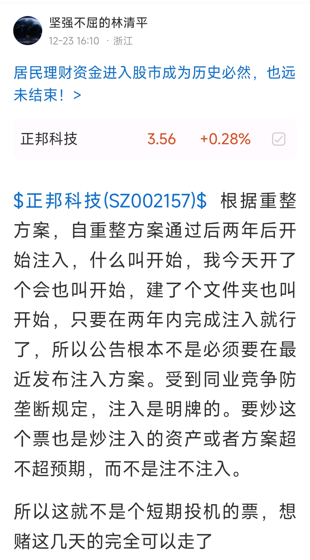 $正邦科技(SZ002157)$ 说了这个吧里都是短线客,非常浮躁。注入时间是从25年12月开始到27年12月,今天发个公告宣布注资开始了,很符合预期,和我那天预测的基本一样,当然这不符合短线赌徒的预期,他们都想着直接出个利好结果然后开始大涨。所以周一短线客会出逃,股价会有一定压力,但不影响长期走势
