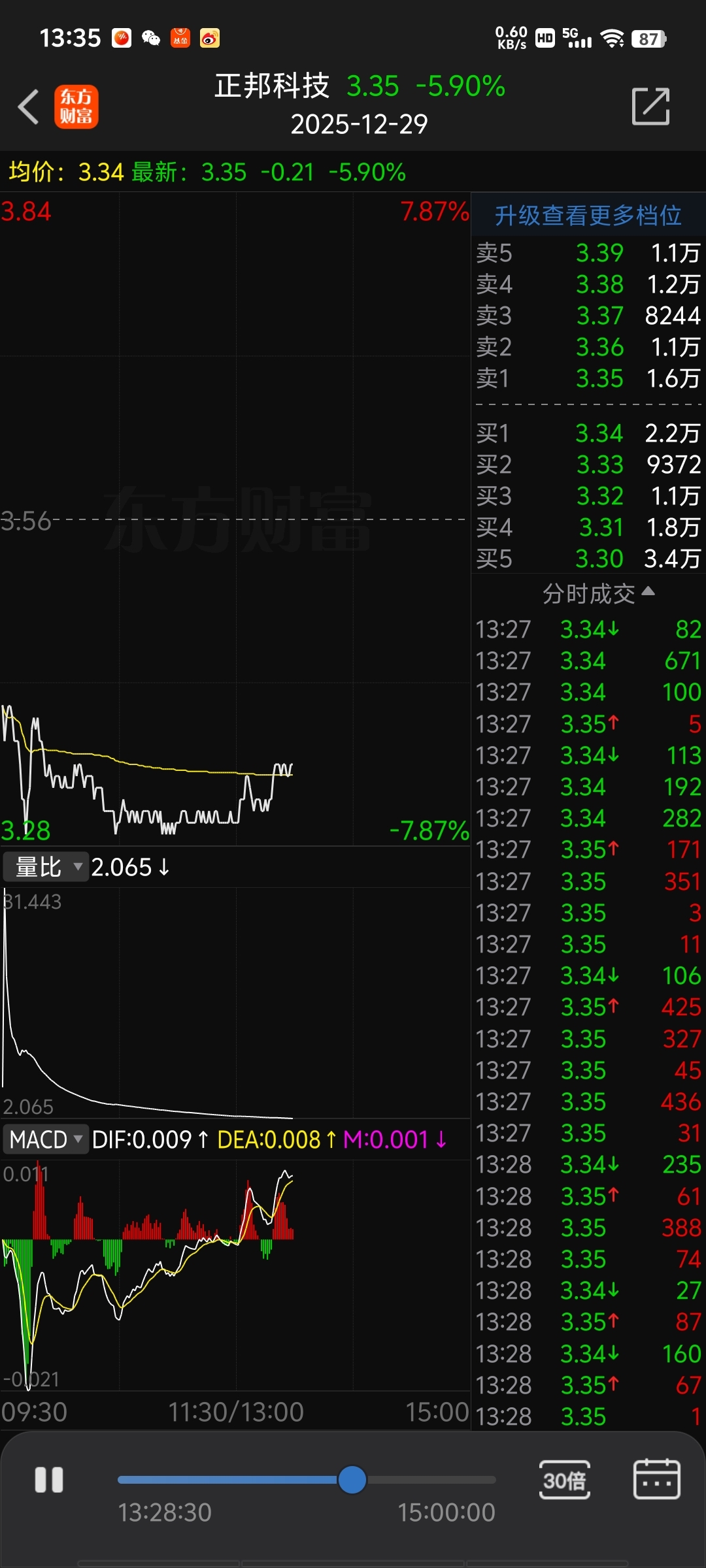 $正邦科技(SZ002157)$ 没仓位了。T底仓全出了。要不是还要跌。我加仓了。短线无法买卖了,开盘价买的。明天最多看到3.41。复盘看了一下大单子砸小单子拉。3.32人进货。短线看跌了。长线还行