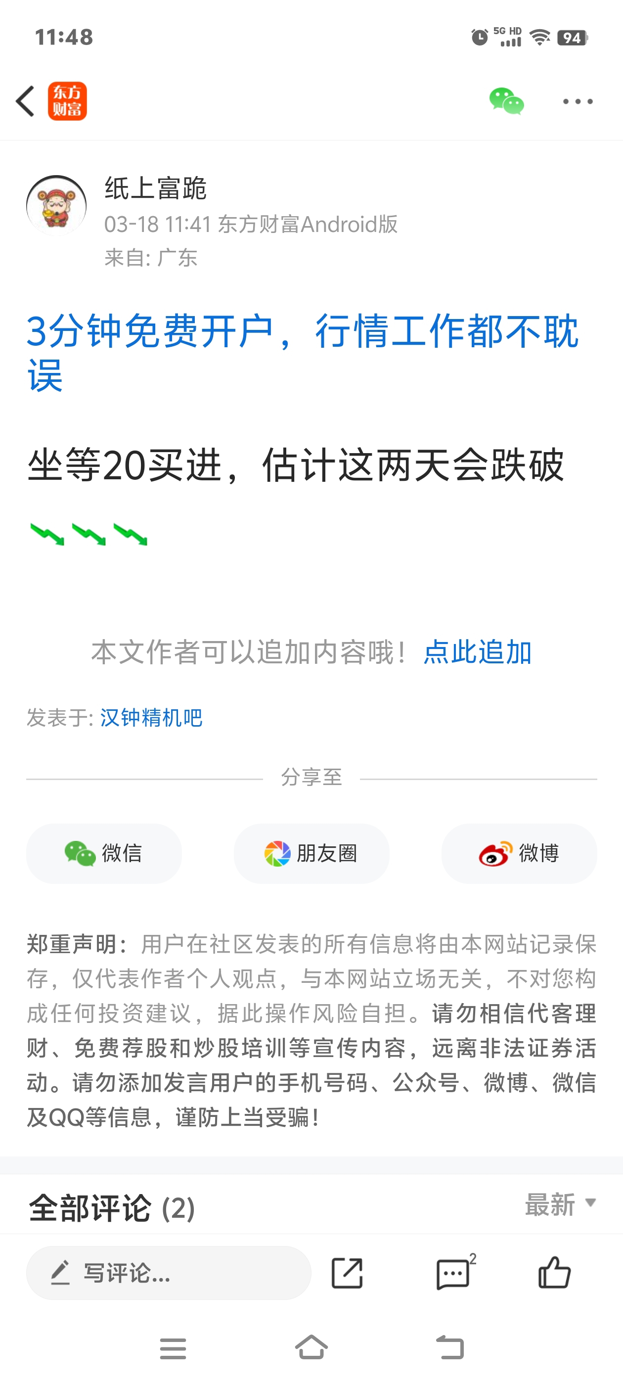 温馨提示: 1.根据《证券法》规定,禁止编造、传播虚假信息或者误导性信息,扰乱证券市场;2.用户在本社区发表的所有资料、言论等仅代表个人观点,与本网站立场无关,不对您构成任何投资建议。用户应基于自己的独立判断,自行决定证券投资并承担相应风险。《东方财富社区管理规定》