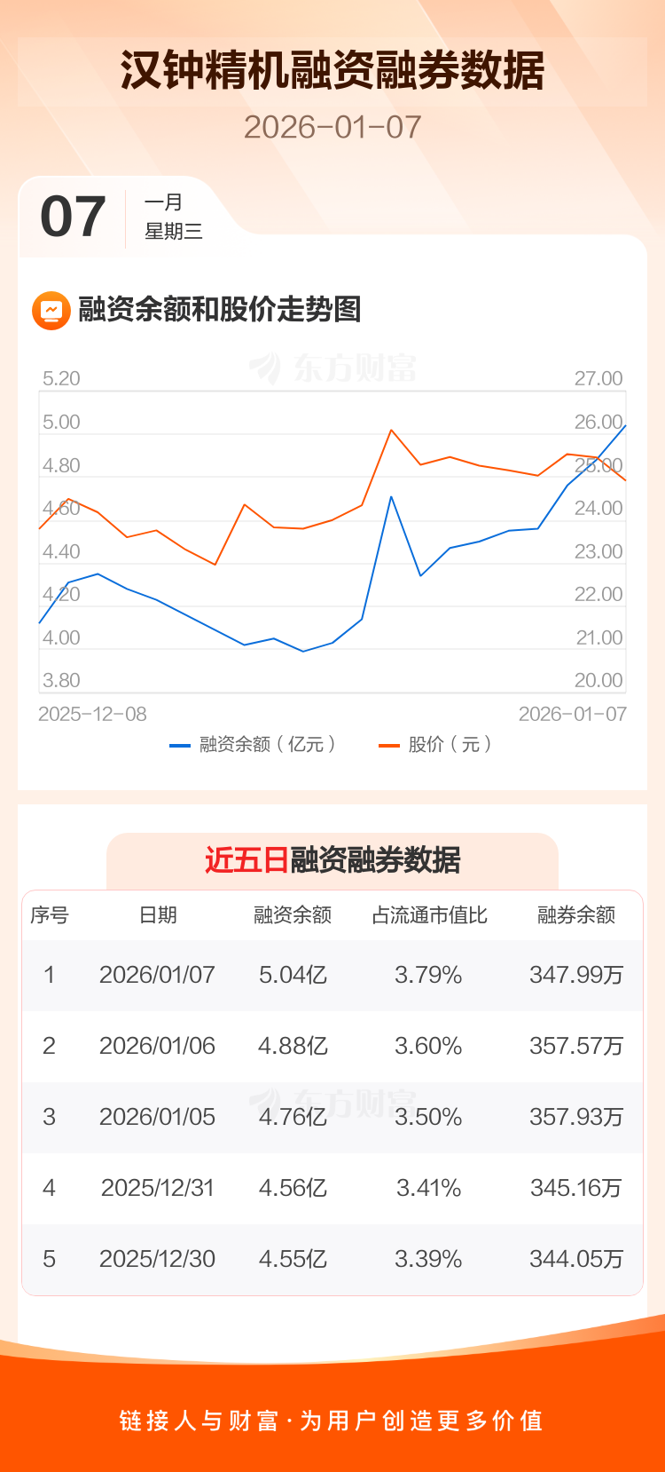 交易所最新数据显示,汉钟精机于2026年1月7日获融资买入5341.18万元,融资偿还3777.38万元,当日融资净买入1563.79万元。目前,该股融资余额5.04亿,占流通市值比例为3.79%。