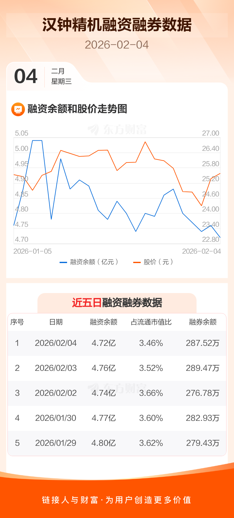 交易所最新数据显示,汉钟精机于2026年2月4日获融资买入561.26万元,融资偿还923.46万元,当日融资净偿还362.21万元。目前,该股融资余额4.72亿,占流通市值比例为3.46%。