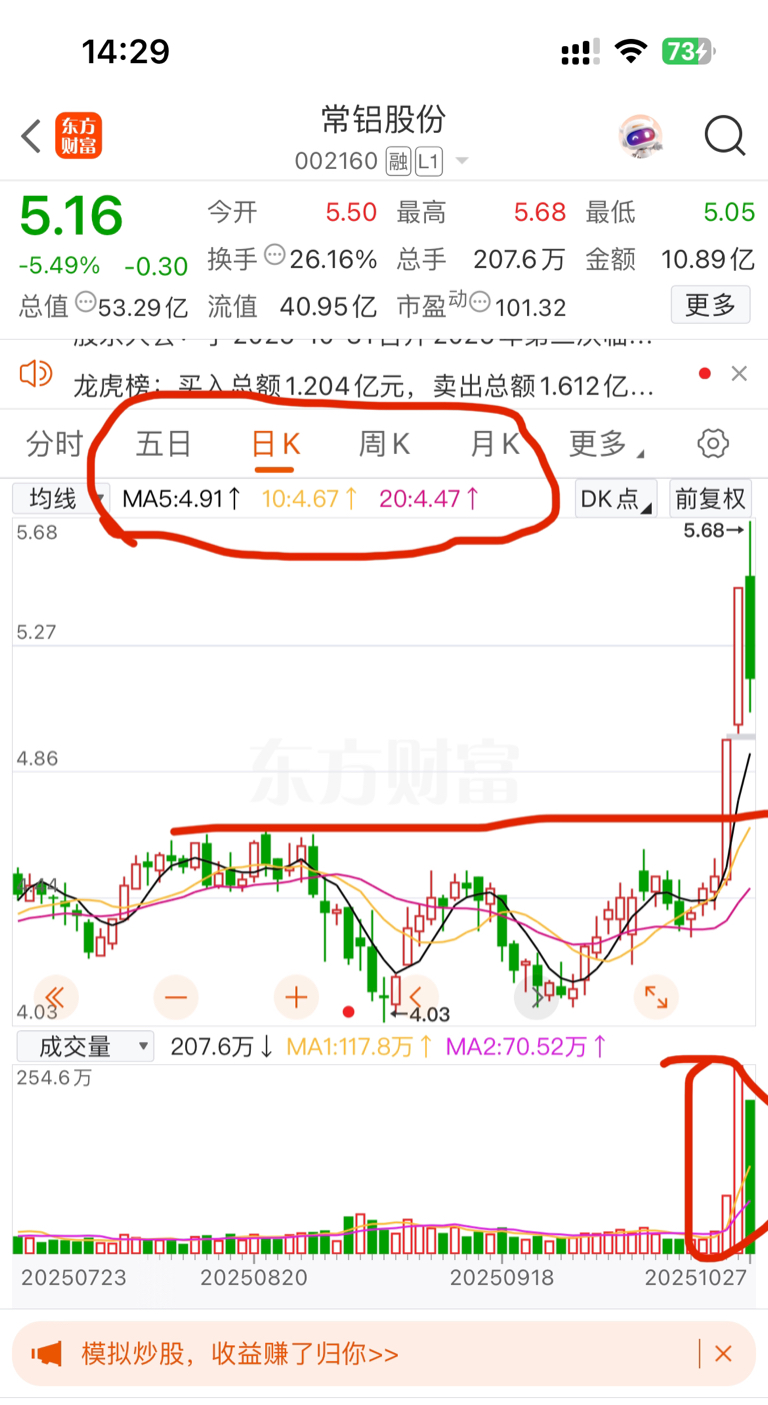 $常铝股份(SZ002160)$ 上午买了20手5.12,现在继续买20手5.16,突破平台才2-3天不可能大回调的。而且量有那么多。目前调整也是分时调整,5-15分时有拉升迹象。就看尾盘15-30分钟了。日,周,月全部多头走7-8元目标上的。