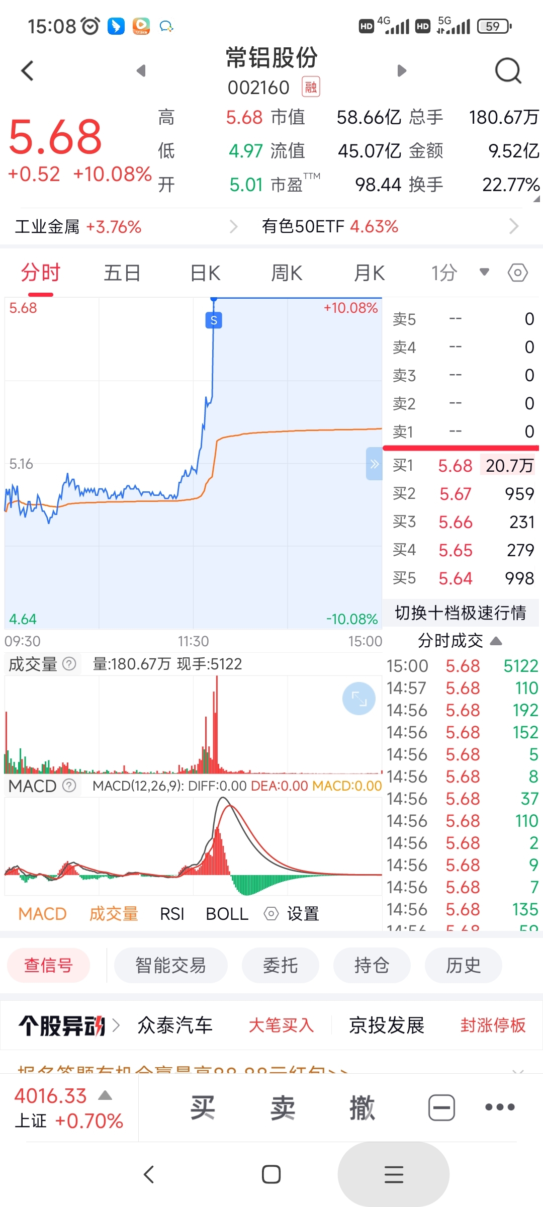 郁闷了,因为今天比较忙,没空看盘,就盘前挂了4.96补仓价(差1分没补到),又挂了个5.49卖单,下午直接拉板把卖单成交了