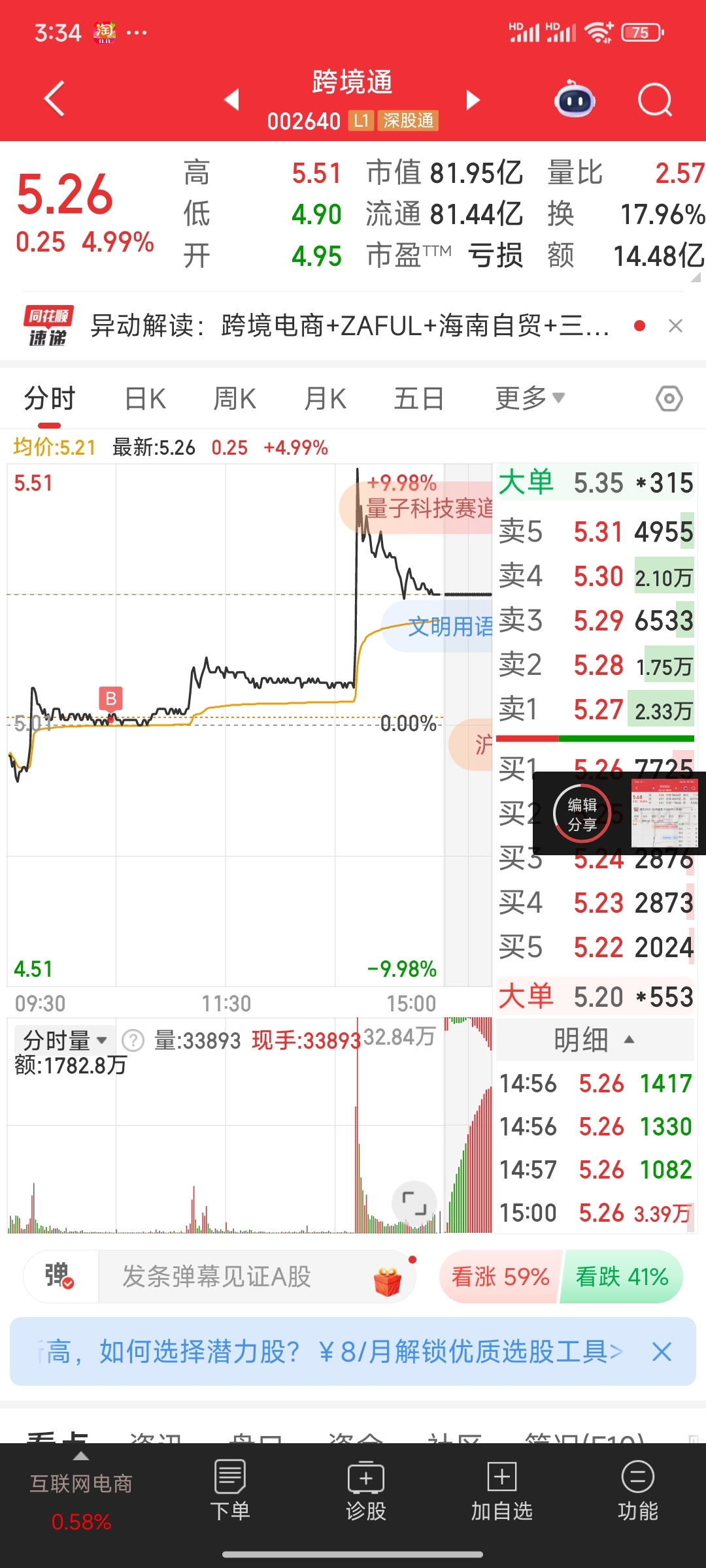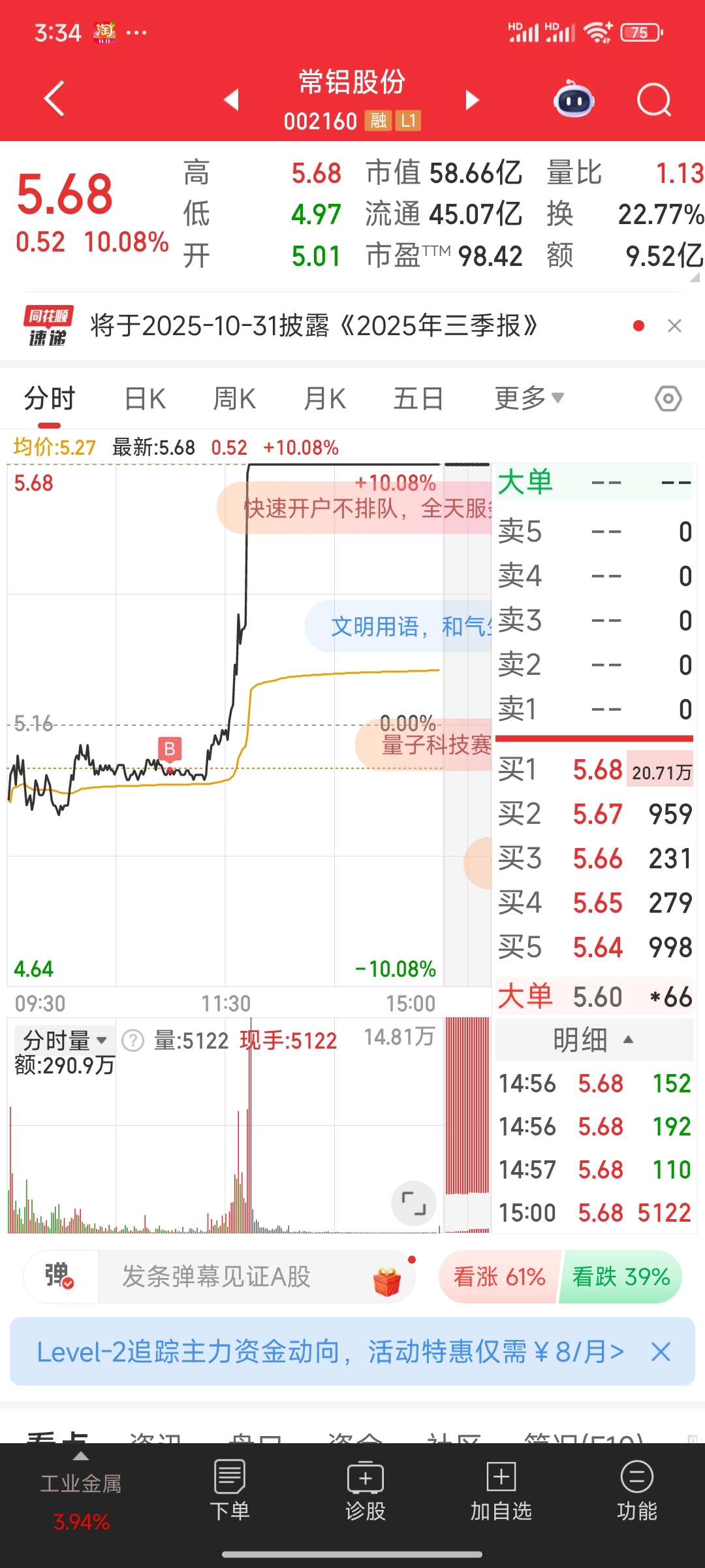 今天早盘就买了两个股,一个涨停,一个没封板跌下来了。希望明天给口肉吃