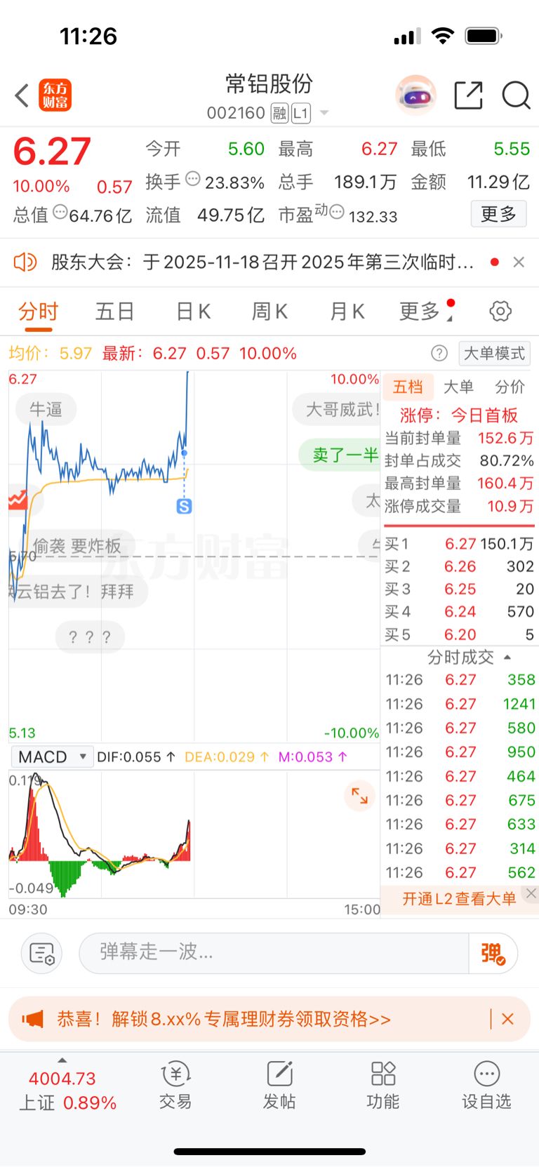 $常铝股份(SZ002160)$ 哪怕你下午再涨停也好啊