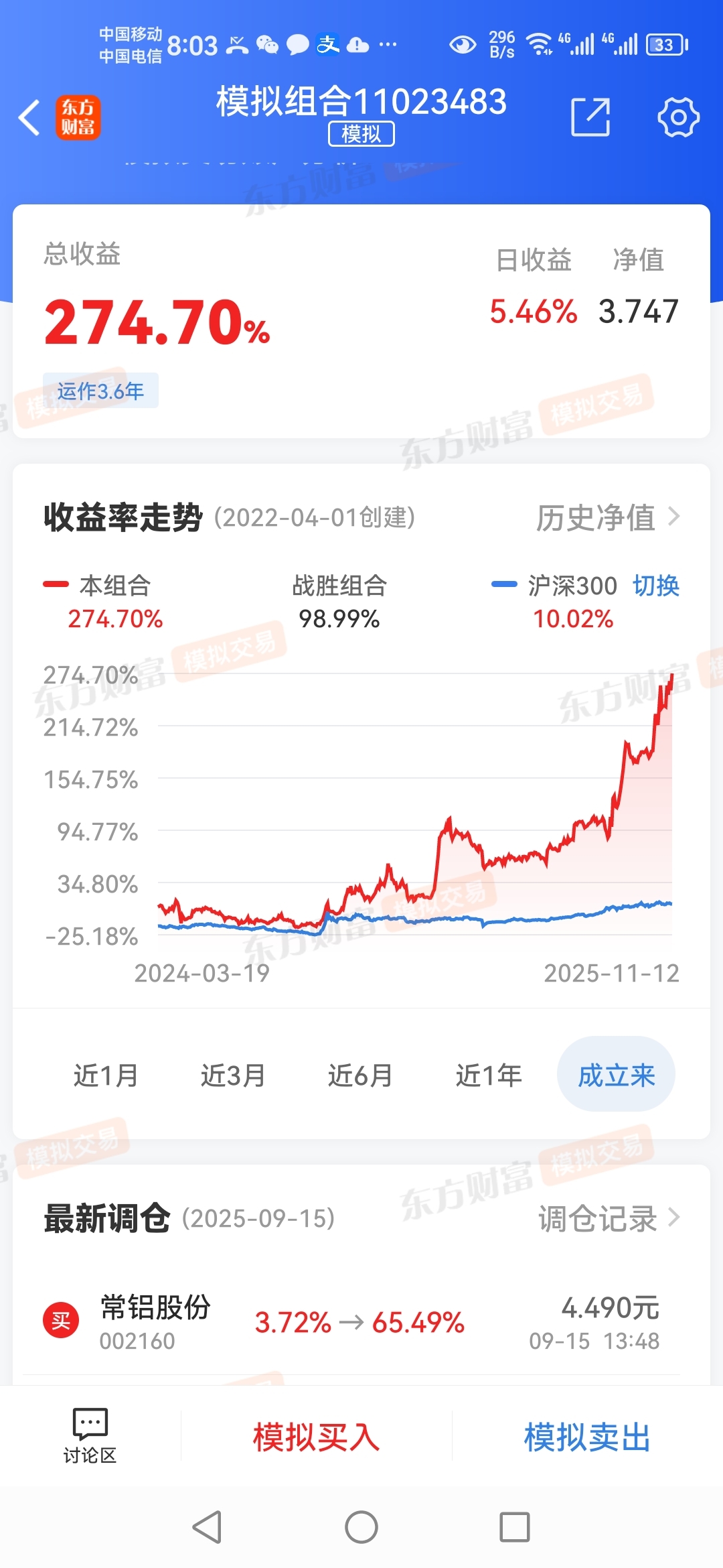 $常铝股份(SZ002160)$ 模拟盘运作3.6年,总收益274.70%,战胜98.99%组合。我那里亏了二十多万?