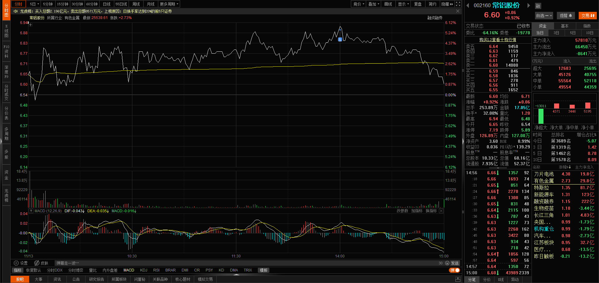 常铝股份今日反弹无力,6.90元减仓了,明天有望低开高走,看盘买卖就是。