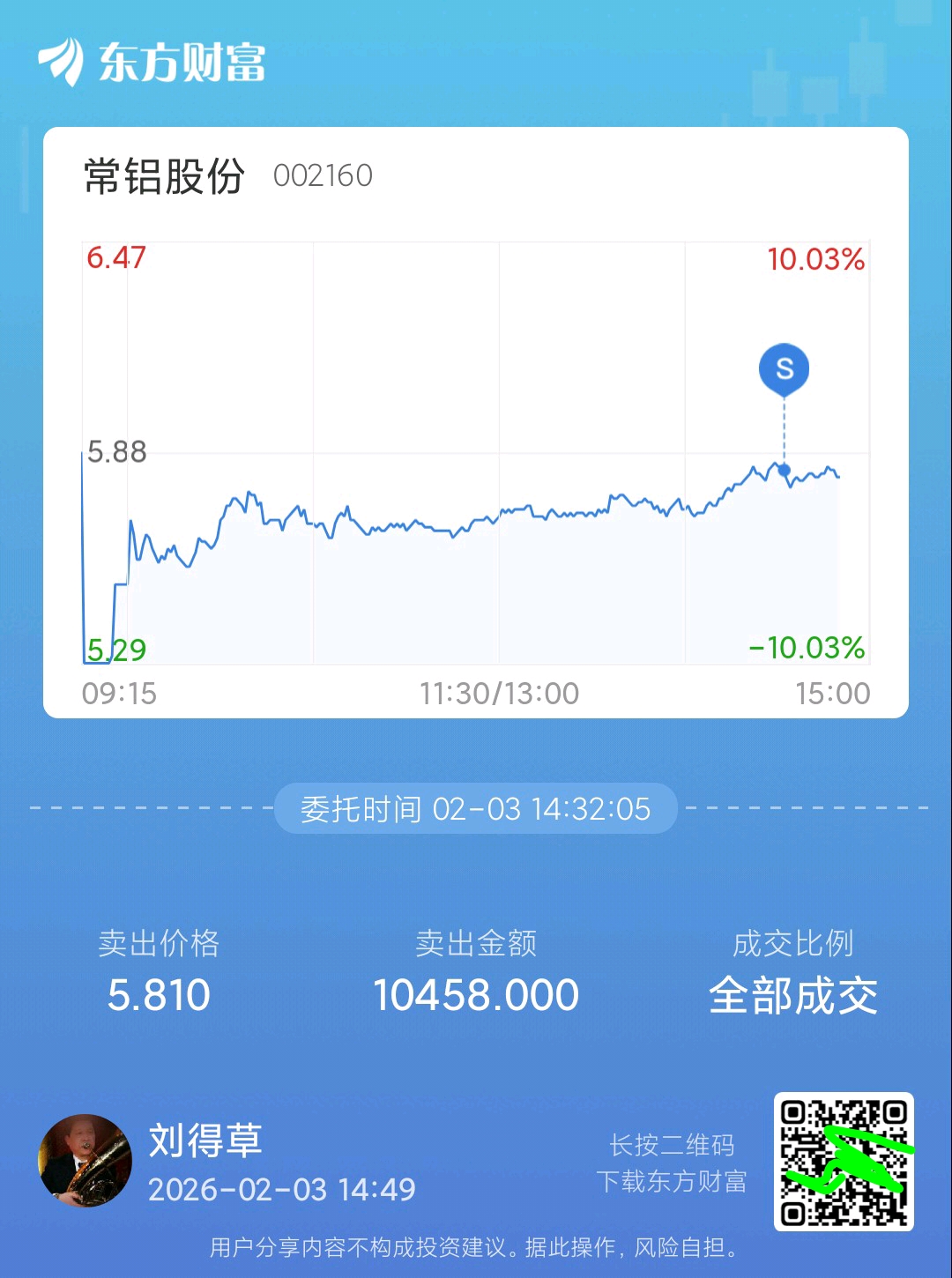 $常铝股份(SZ002160)$ 今天放量收假阳线,换句话是放量下跌,而且是水下,底在那里不得而知,尾盘小幅减仓,不适合补仓。