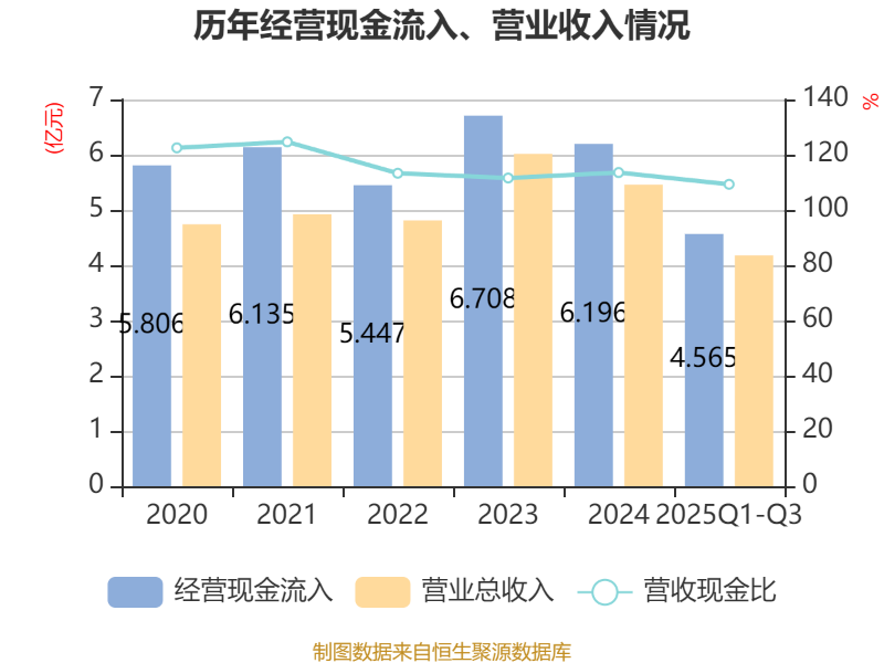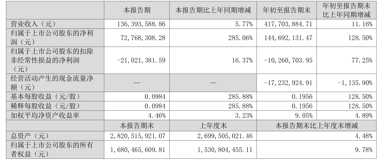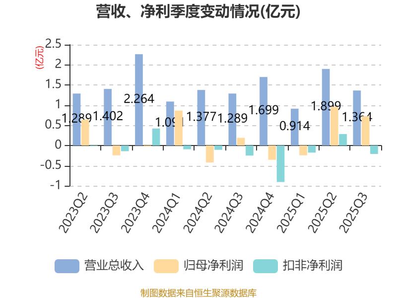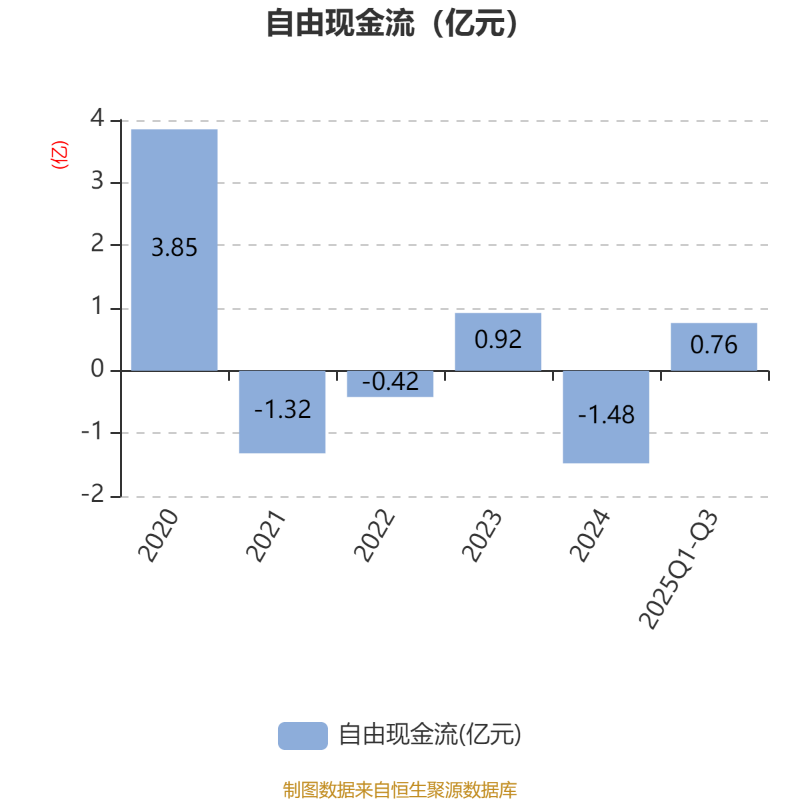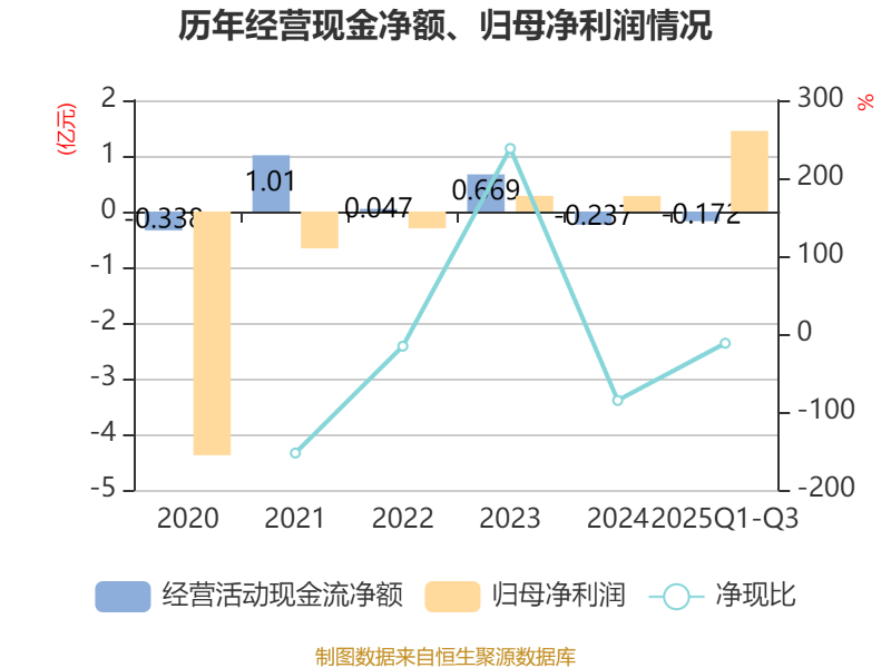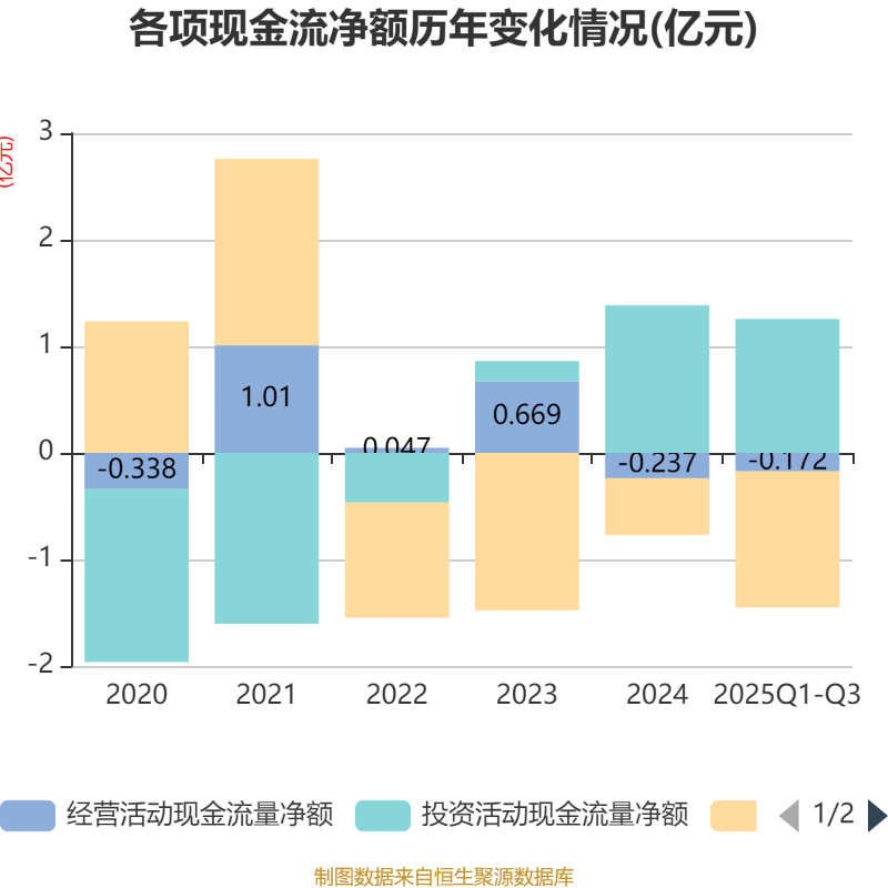 2025年前三季度,公司经营活动现金流净额为-1723.29万元,同比减少1889.65万元;筹资活动现金流净额-1.28亿元,同比减少8419.76万元;投资活动现金流净额1.26亿元,上年同期为3809.04万元。