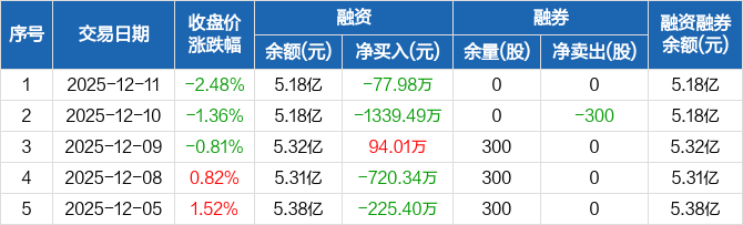 远望谷:融资净偿还77.98万元,融资余额5.18亿元(12-11)