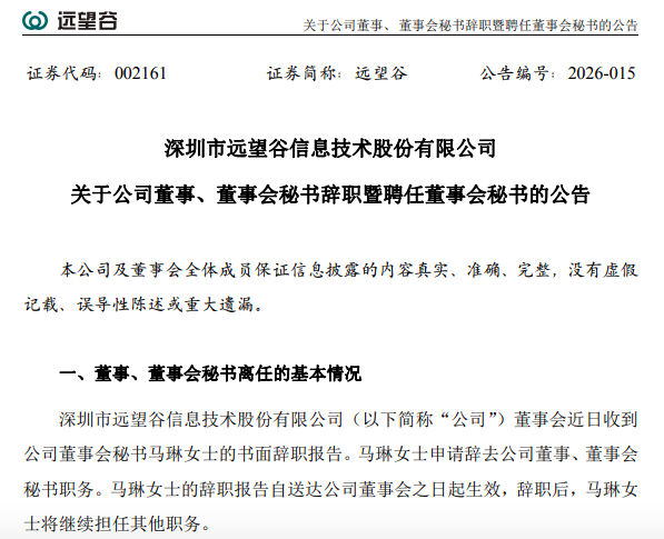 2月24日晚,远望谷(002161)发布公告,近日公司完成变更董事会秘书事宜,马琳女士辞去公司董事、董事会秘书职务,同时公司聘任范誉舒馨女士担任董事会秘书职务。