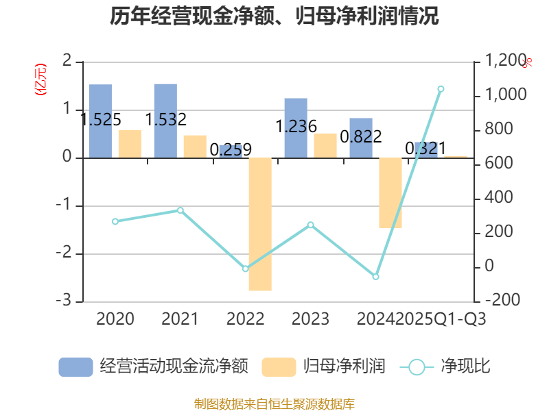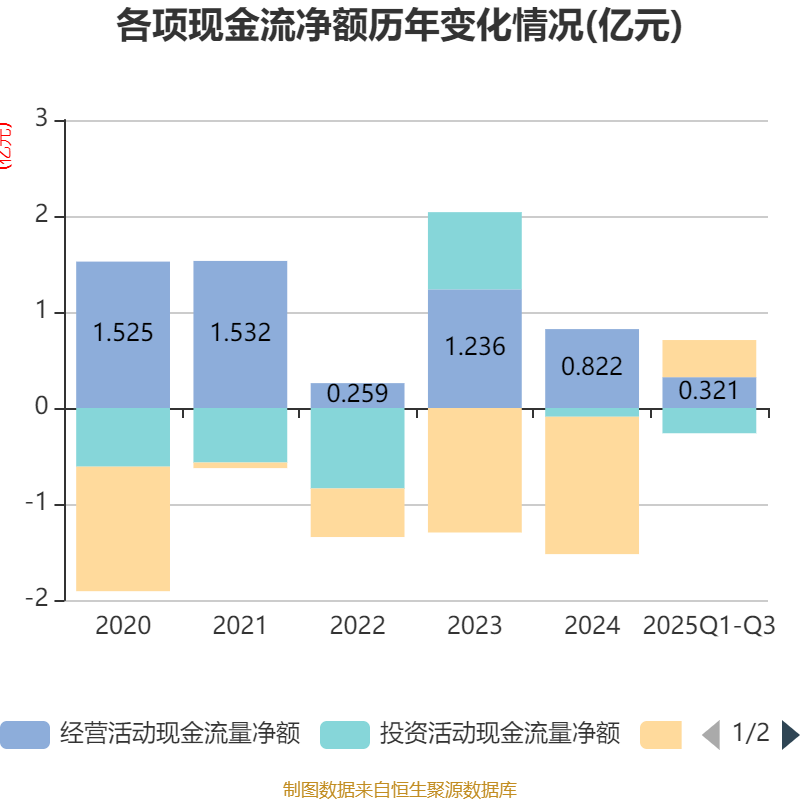 2025年前三季度,公司经营活动现金流净额为3209.69万元,同比下降4.24%;筹资活动现金流净额3868.23万元,同比增加2620.46万元;投资活动现金流净额-2631.18万元,上年同期为-9427.6万元。