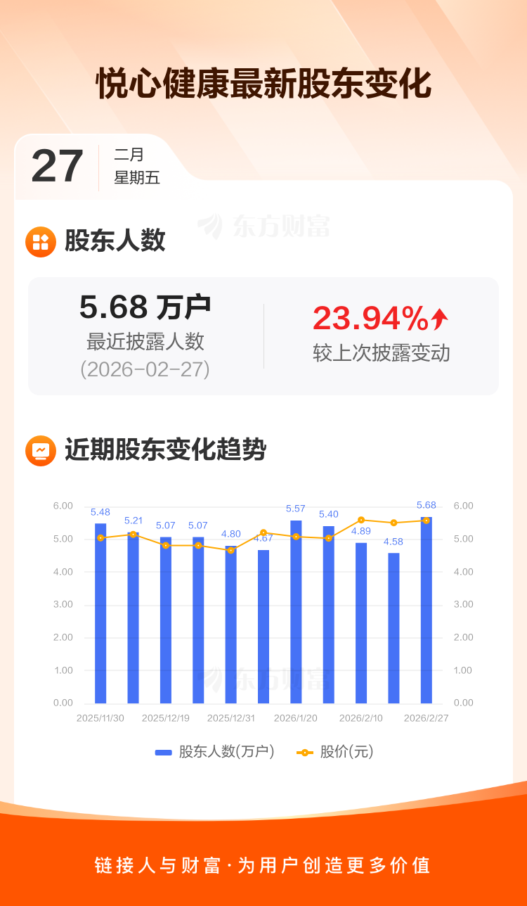 悦心健康:截至2月27日最新股东户数5.68万户,较上期增加23.94%