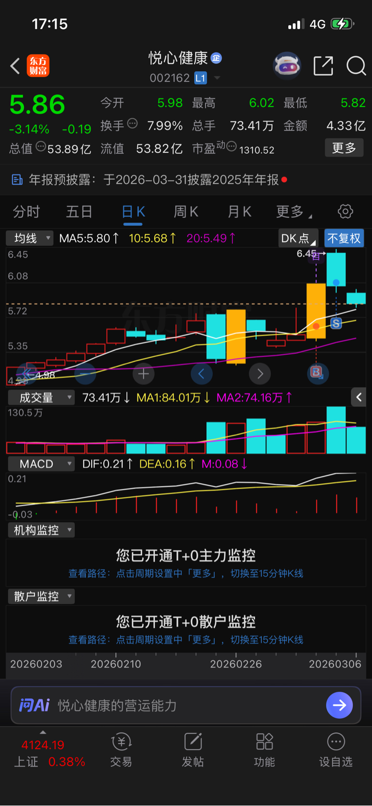 $悦心健康(SZ002162)$ 昨天跑的,感觉要跌到5.3左右才能止跌
