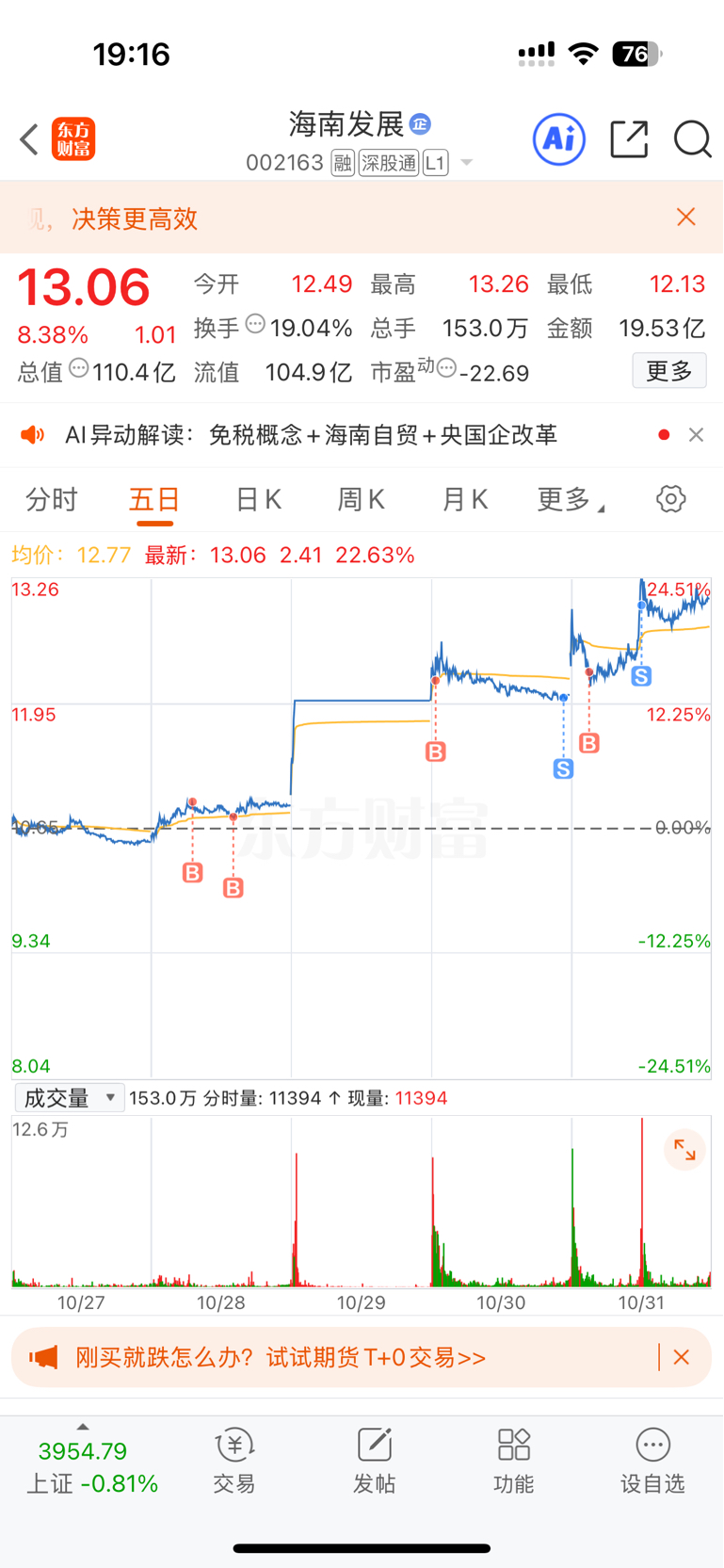 $海南发展(SZ002163)$ 留了2手做做t,哥们我应该不会亏本吧