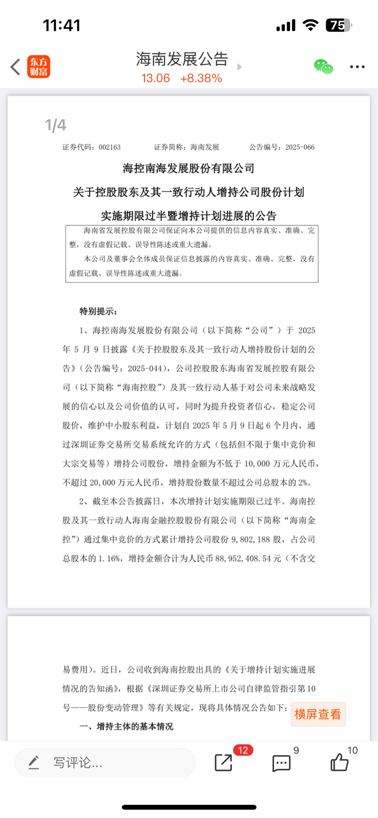 $海南发展(SZ002163)$ 增持1到2个亿,目前只增持8800万,最少还有几千万增持,截止到11月9号,意思就是下周五之前必须全部增持完,周末出公告,要起飞了,大股东周一捡便宜筹码了。