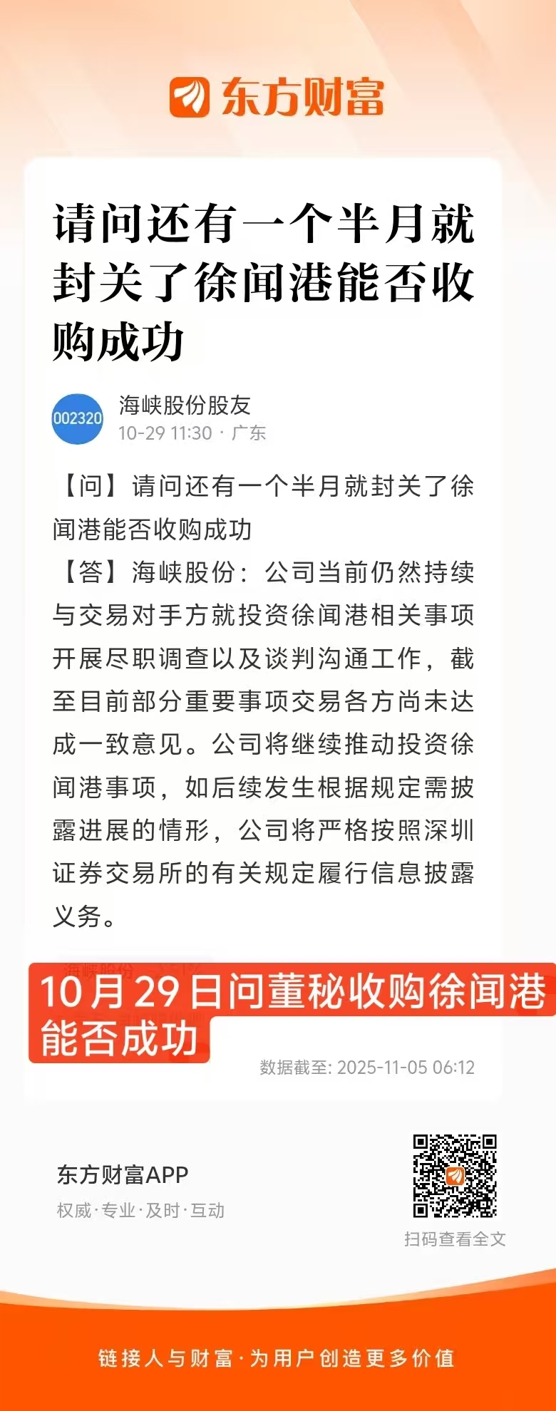 10月29日海峡股份董秘回复投资者:收购徐闻港正在做尽职调查和谈判工作!