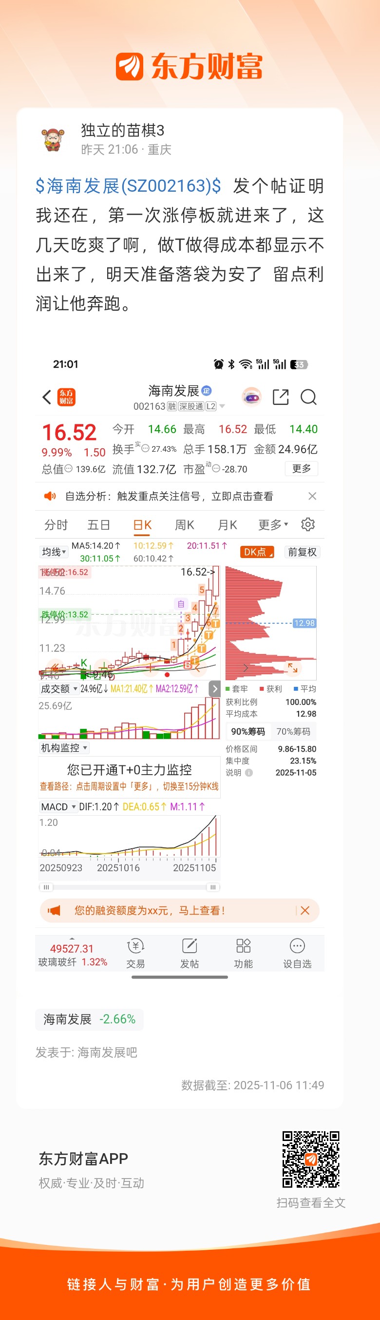 $海南发展(SZ002163)$ 发个帖证明我还在,第一次涨停板就进来了,这几天吃爽了啊,做T做得成本都显示不出来了,明天准备落袋为安了 留点利润让他奔跑。