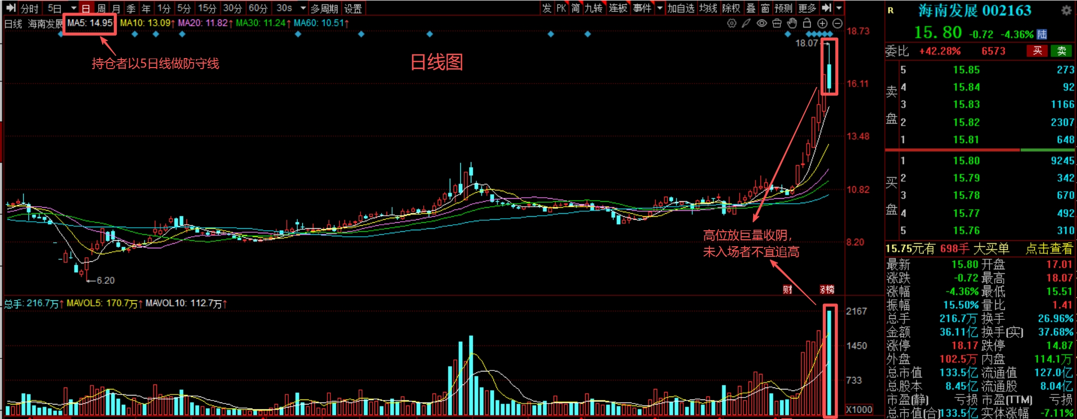 $海南发展(SZ002163)$ 今日高位震荡收阴,股价在5日线(14.95元)上方展开调整。当前需观察5日线支撑力度,若能守住则仍属强势整理,后市有望再次上攻18元压力位;若失守5日线则可能下探14元整数关口。鉴于公司仍处亏损状态且单日换手率高达27%,建议持仓者以5日线为防守位,未入场者不宜追高。