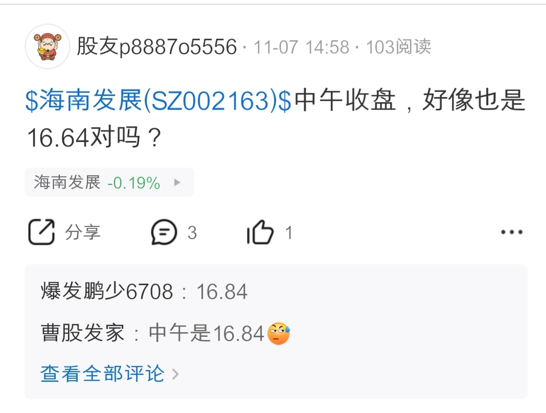 $海南发展(SZ002163)$ 11月7号中午收盘价16.84,下午收盘价是16.64!今天中午收盘价是15.94,猜猜下午收盘价是多少?