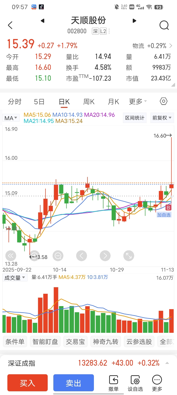 $海南发展(SZ002163)$ 九牧王走弱,买入天顺股份15.42