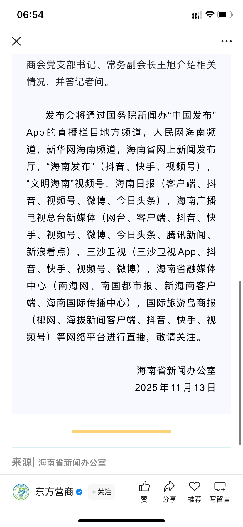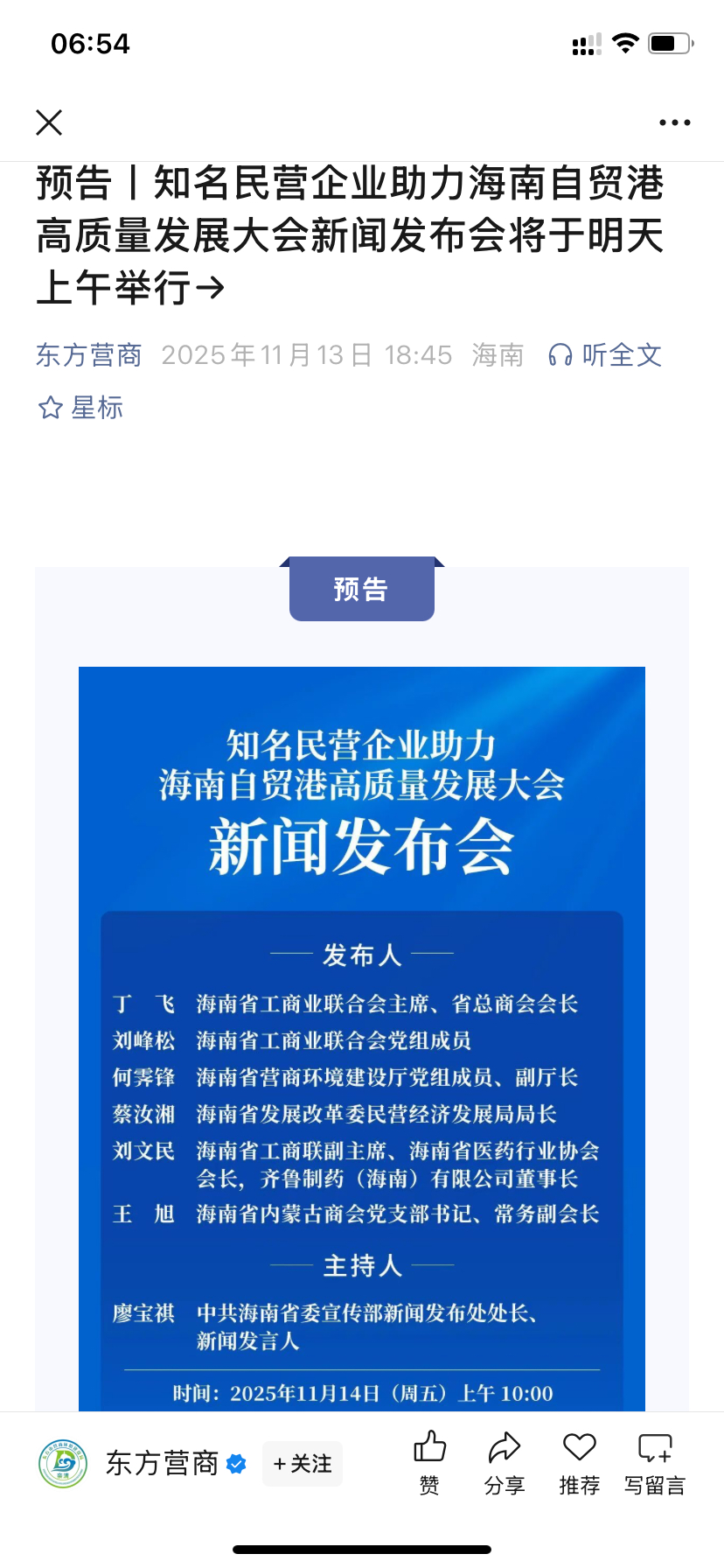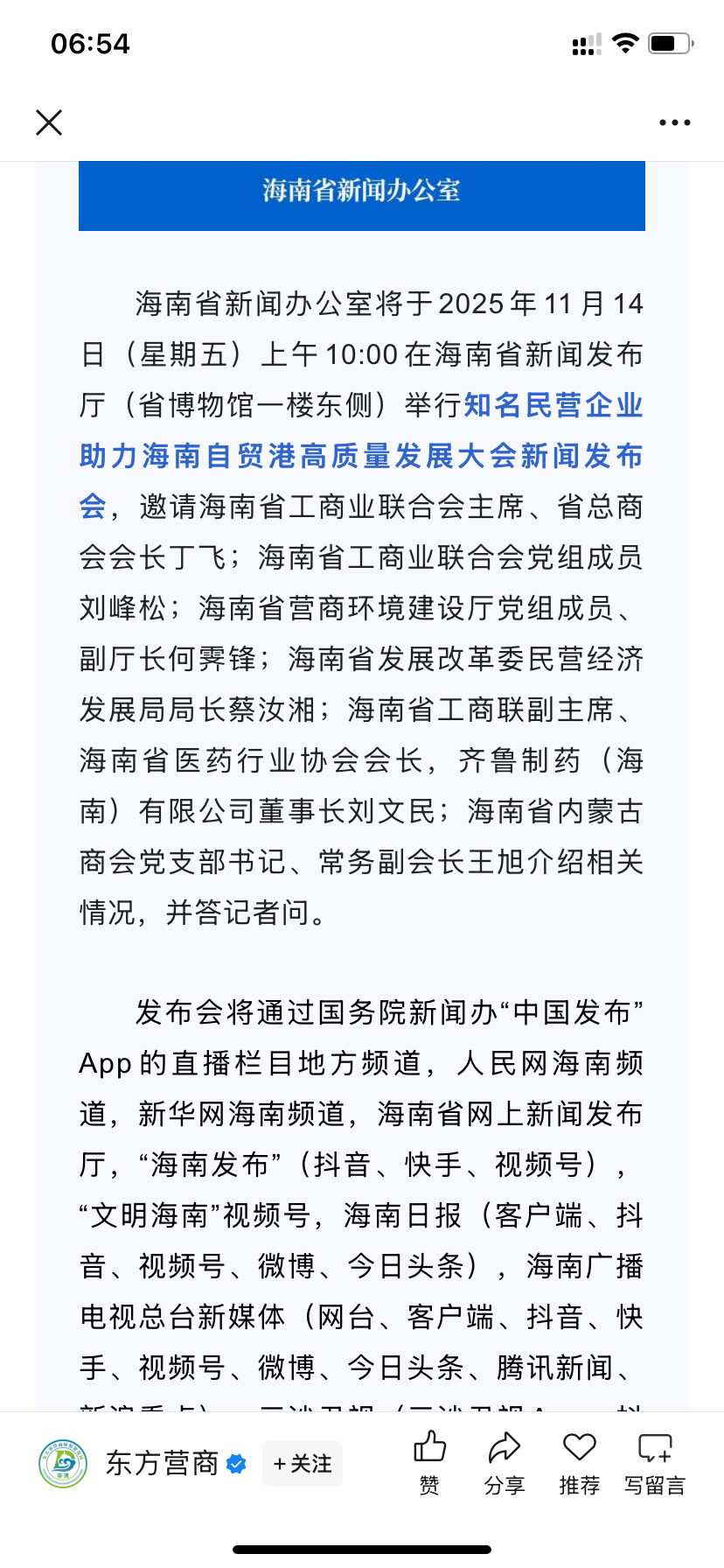海南发展特大利好来了:知名民营企业助力海南自贸港高质量发展大会新闻发布会将于2025年11月14日上午举行。注意关键字:海南+发展