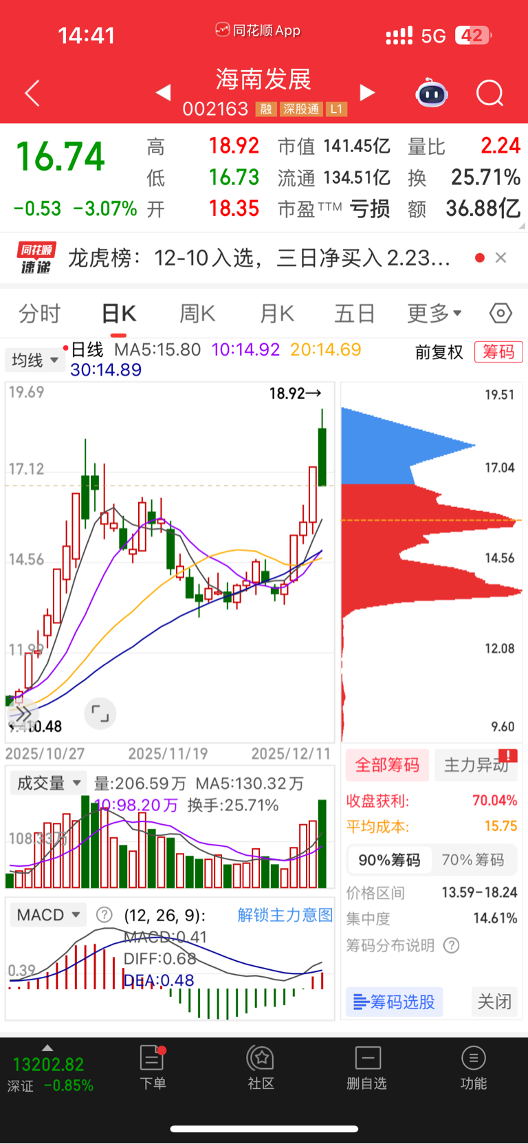 $海南发展(SZ002163)$ 看这被套住的筹码峰,还觉得有底可炒,还不跑,明天也要跌的