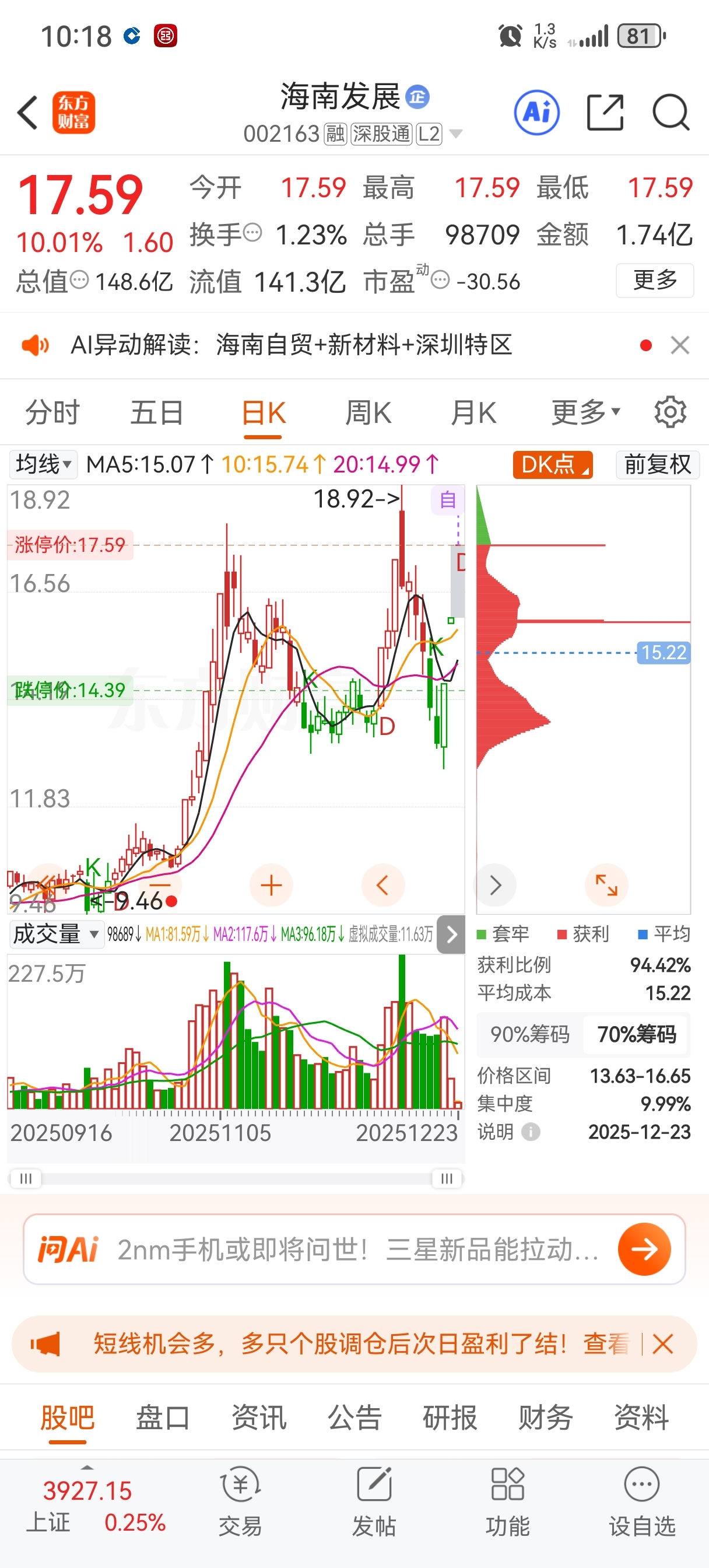 如果今天不开板,不换手。明天必开板马上要到18.92最高点肯定释放套牢盘和拉高平
