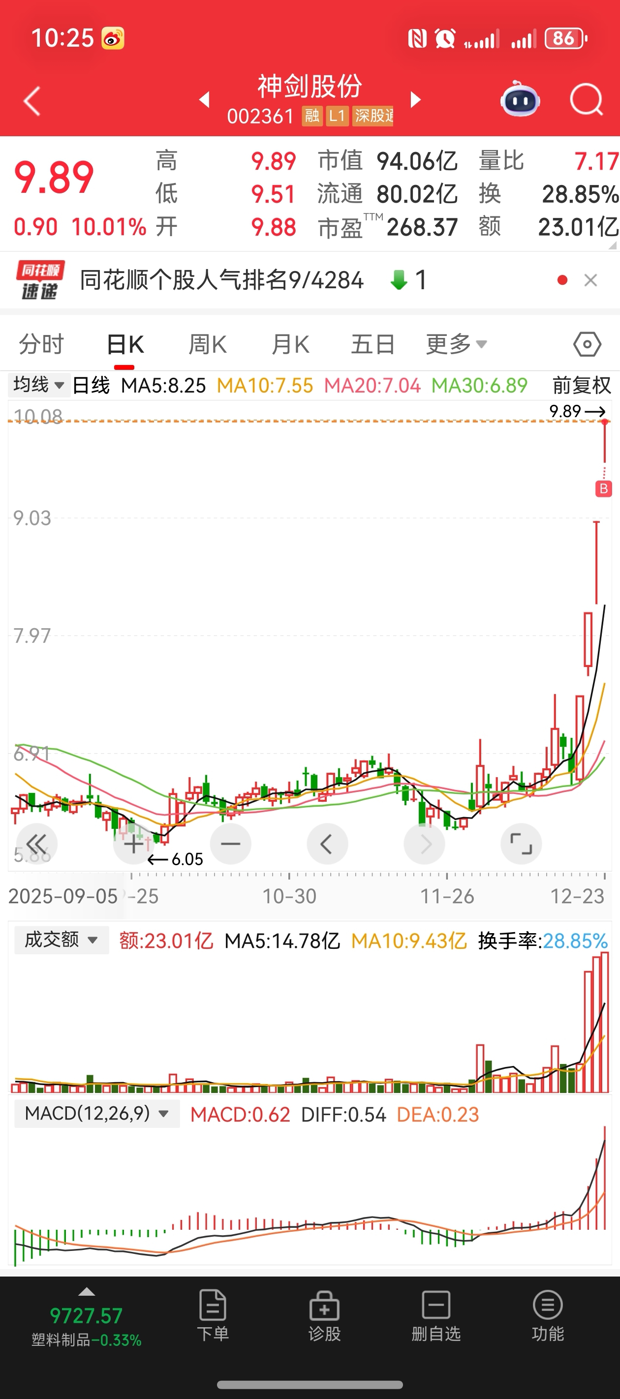 $海南发展(SZ002163)$ $神剑股份(SZ002361)$ 12月23日9点28分:1.神剑股份单点3天,盯板止盈或T小肉。