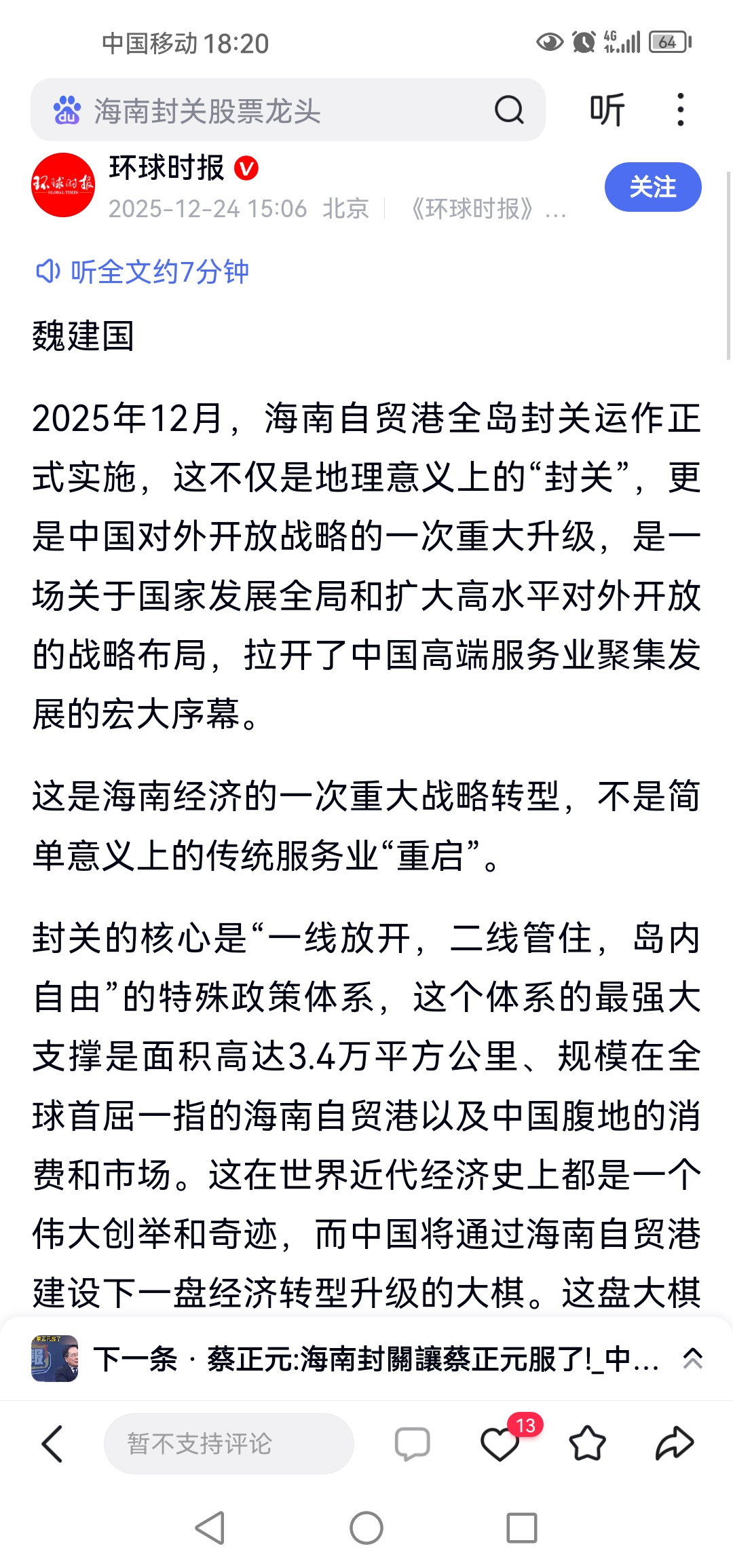 环球时报:海南封关在世界近代经济史上都是一个伟大创举和奇迹,而中国将通过海南自贸港建设下一盘经济转型升级的大棋。
