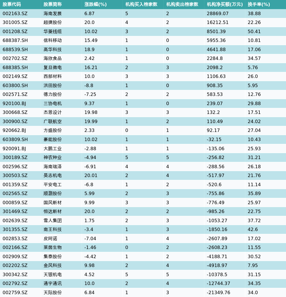 南财智讯12月25日电,南财金融终端数据显示,因当日异动登上龙虎榜的个股中,32只沪深A股龙虎榜出现了机构的身影,机构合计净买入5767.02万元,具体来看,机构净买入14只个股,净卖出18只个股。其中,机构净买入前三分别为海南发展(002163.SZ)、超捷股份(301005.SZ)与华菱线缆(001208.SZ),详情见下图:机构净卖出的个股中,前三分别为天际股份(002759.SZ)、通宇通讯(002792.SZ)与天银机电(300342.SZ)。