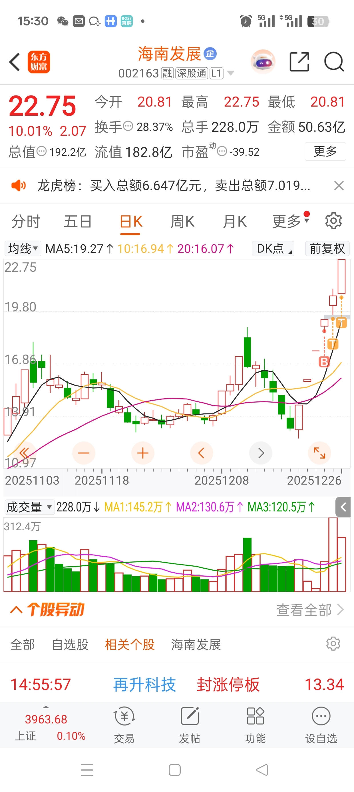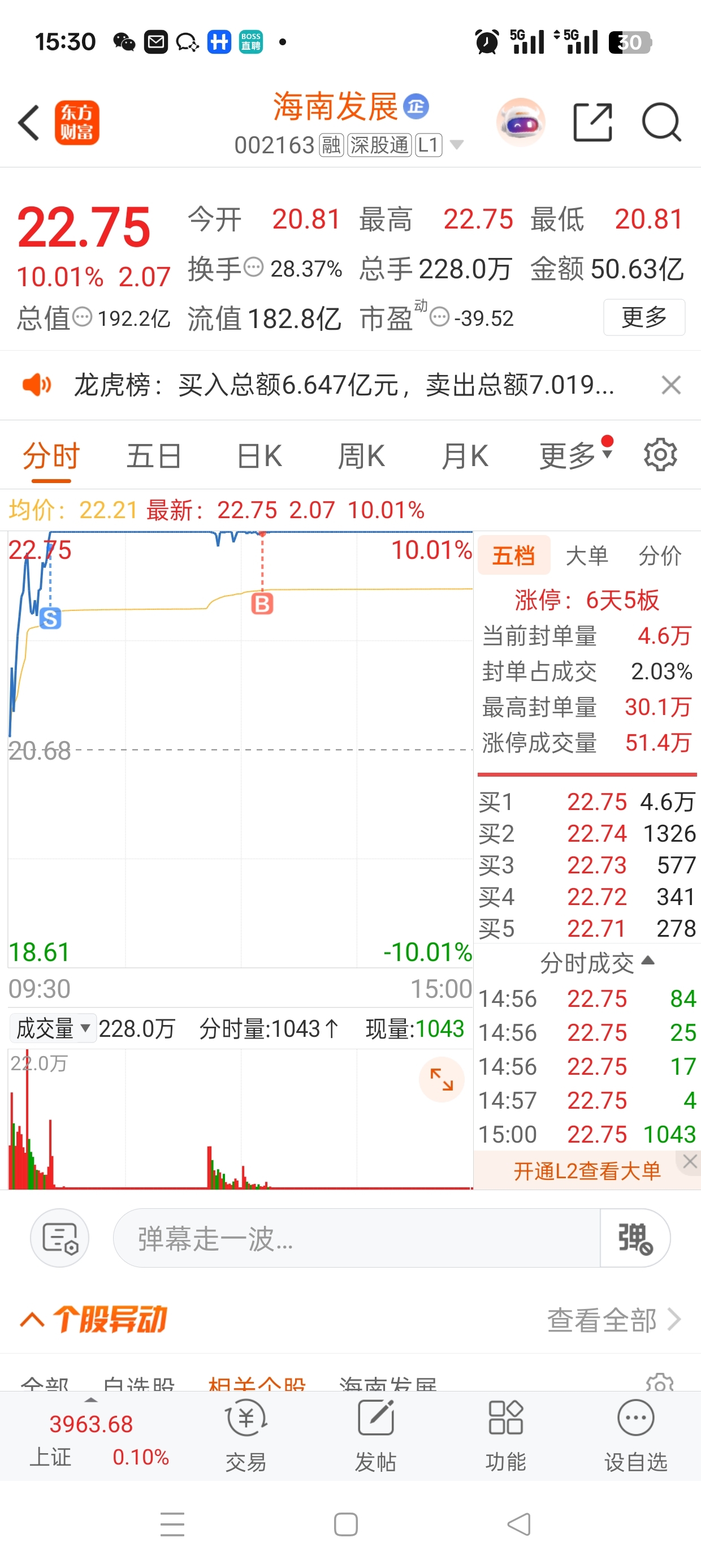 早上本来卖了,后面看到海南好几个涨停,板块效应还不错,刚好大盘跳水的时候海南发展