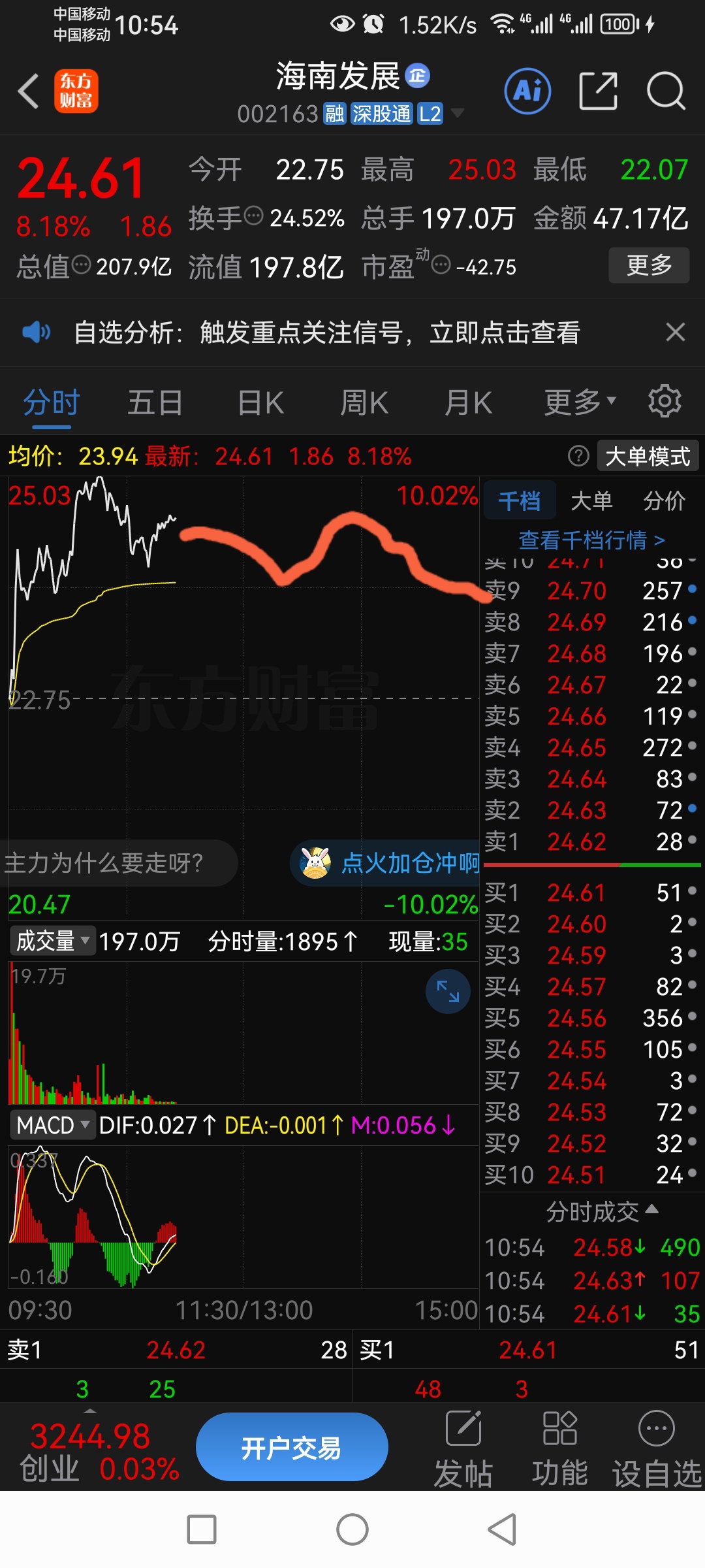$海南发展(SZ002163)$ 海南自贸区板块仅存的唯一高标股,今天继续高位换手就这样慢慢洗盘到5.45%(24元上下)收市就可以了
