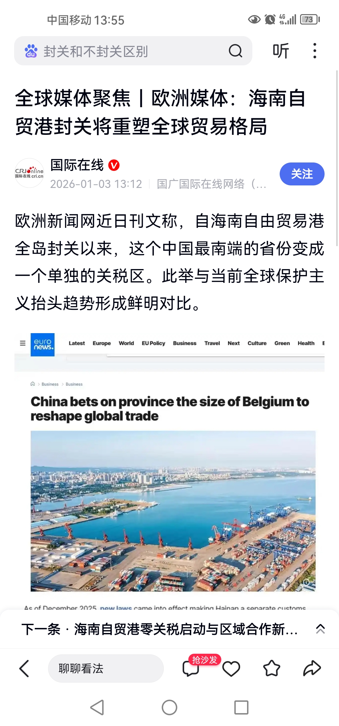 欧洲媒体:海南自贸港封关将重塑全球贸易格局