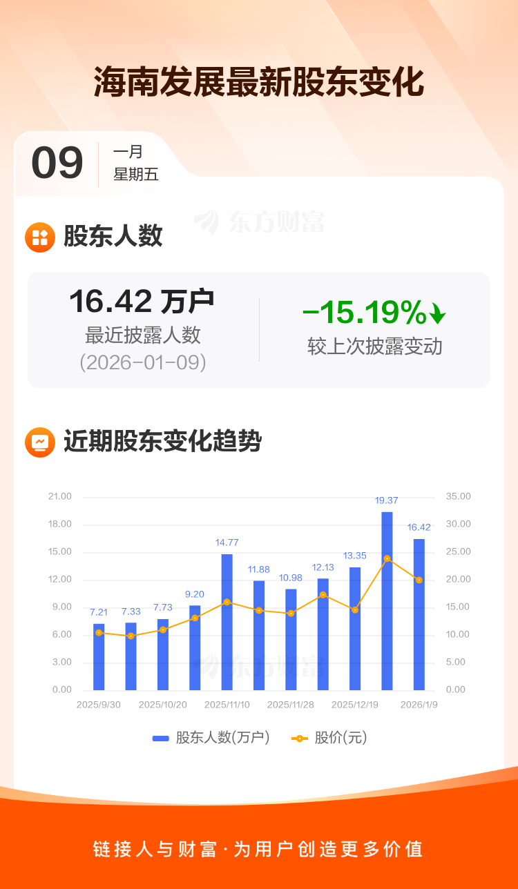 海南发展:截至1月9日最新股东户数16.42万户,较上期减少15.19%