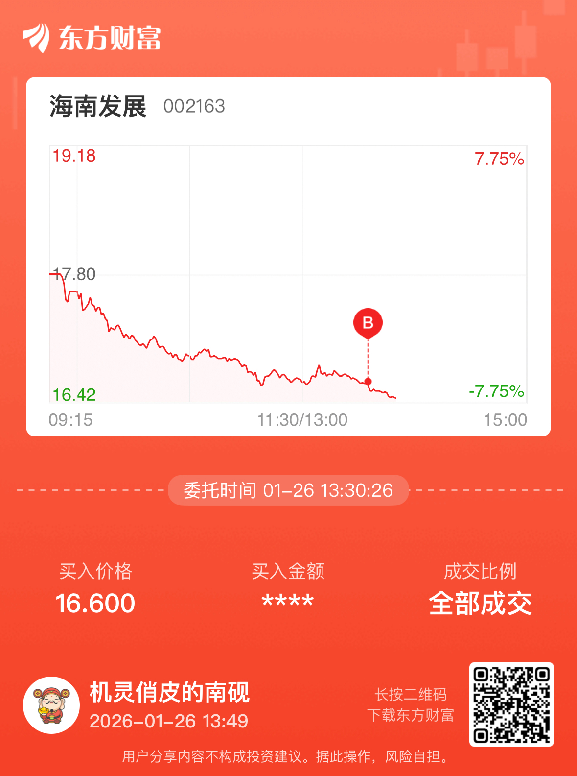 温馨提示: 1.根据《证券法》规定,禁止编造、传播虚假信息或者误导性信息,扰乱证券市场;2.用户在本社区发表的所有资料、言论等仅代表个人观点,与本网站立场无关,不对您构成任何投资建议。用户应基于自己的独立判断,自行决定证券投资并承担相应风险。《东方财富社区管理规定》