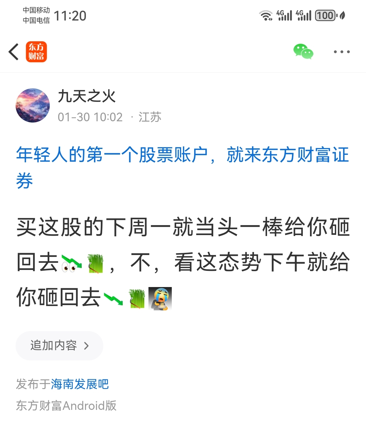 温馨提示: 1.根据《证券法》规定,禁止编造、传播虚假信息或者误导性信息,扰乱证券市场;2.用户在本社区发表的所有资料、言论等仅代表个人观点,与本网站立场无关,不对您构成任何投资建议。用户应基于自己的独立判断,自行决定证券投资并承担相应风险。《东方财富社区管理规定》