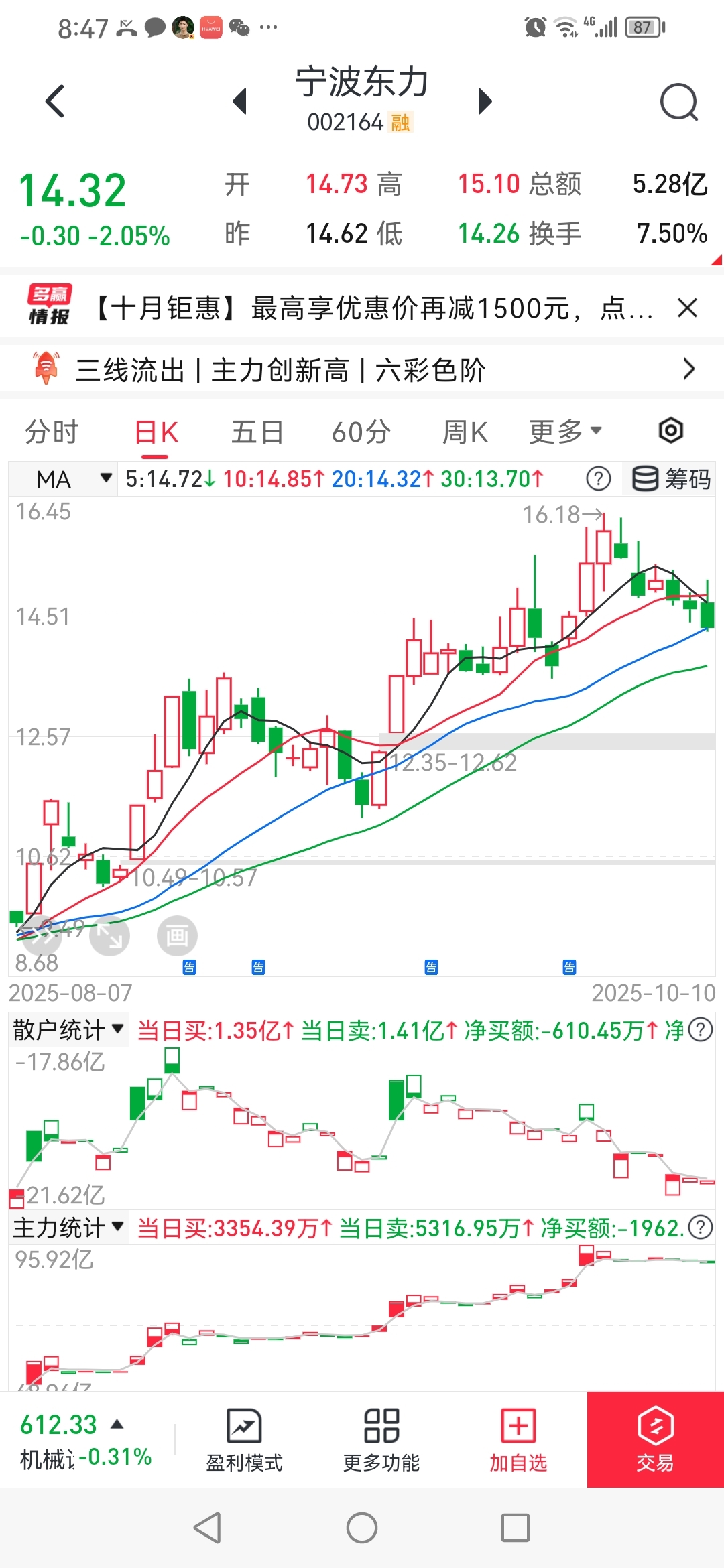 $宁波东力(SZ002164)$ 经传多赢手机版数据短线王123元,量化庄程序请看以往评论区。大单买货,大单是不能随便抛货的,沙茶货。庄吃货,没有必要抛大单货。