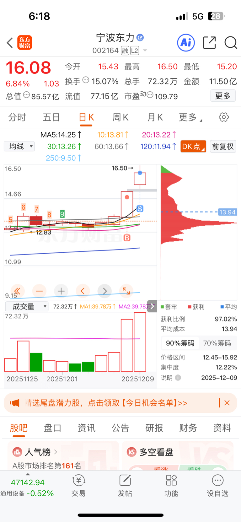 $宁波东力(SZ002164)$ 我走了,留下的就等着套牢吧,今天属于天量,落袋为安
