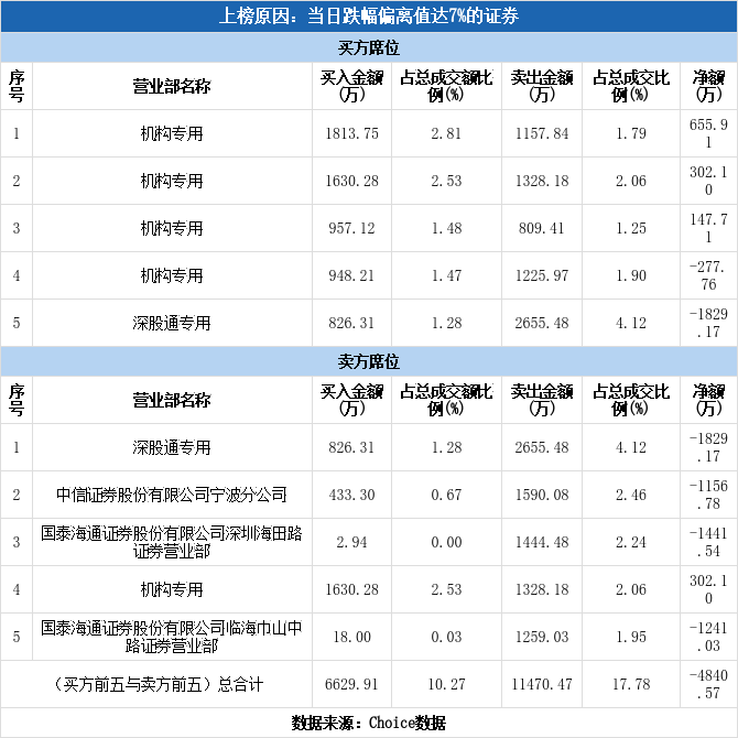 多主力现身龙虎榜,宁波东力跌停(12-24)