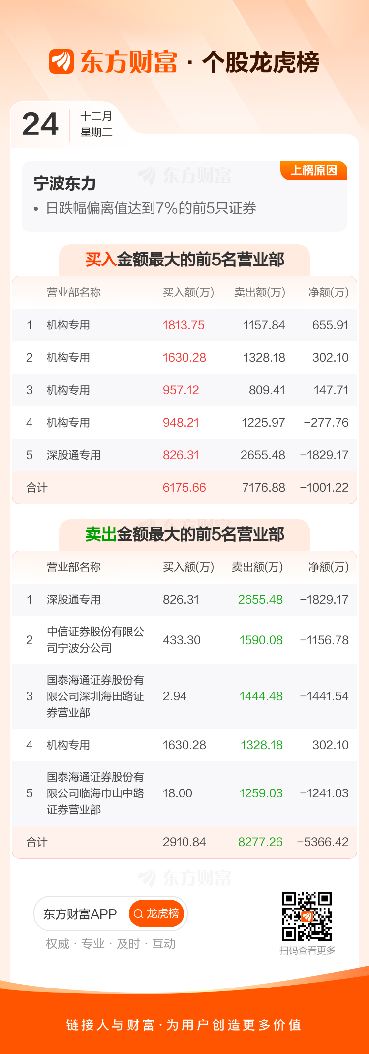 交易所2025年12月24日公布的交易公开信息显示,宁波东力因成为日跌幅偏离值达到7%的前5只证券上榜。宁波东力当日收报15.46元,涨跌幅-10.01%,偏离值-11.04%,换手率8.56%,成交额6.45亿。