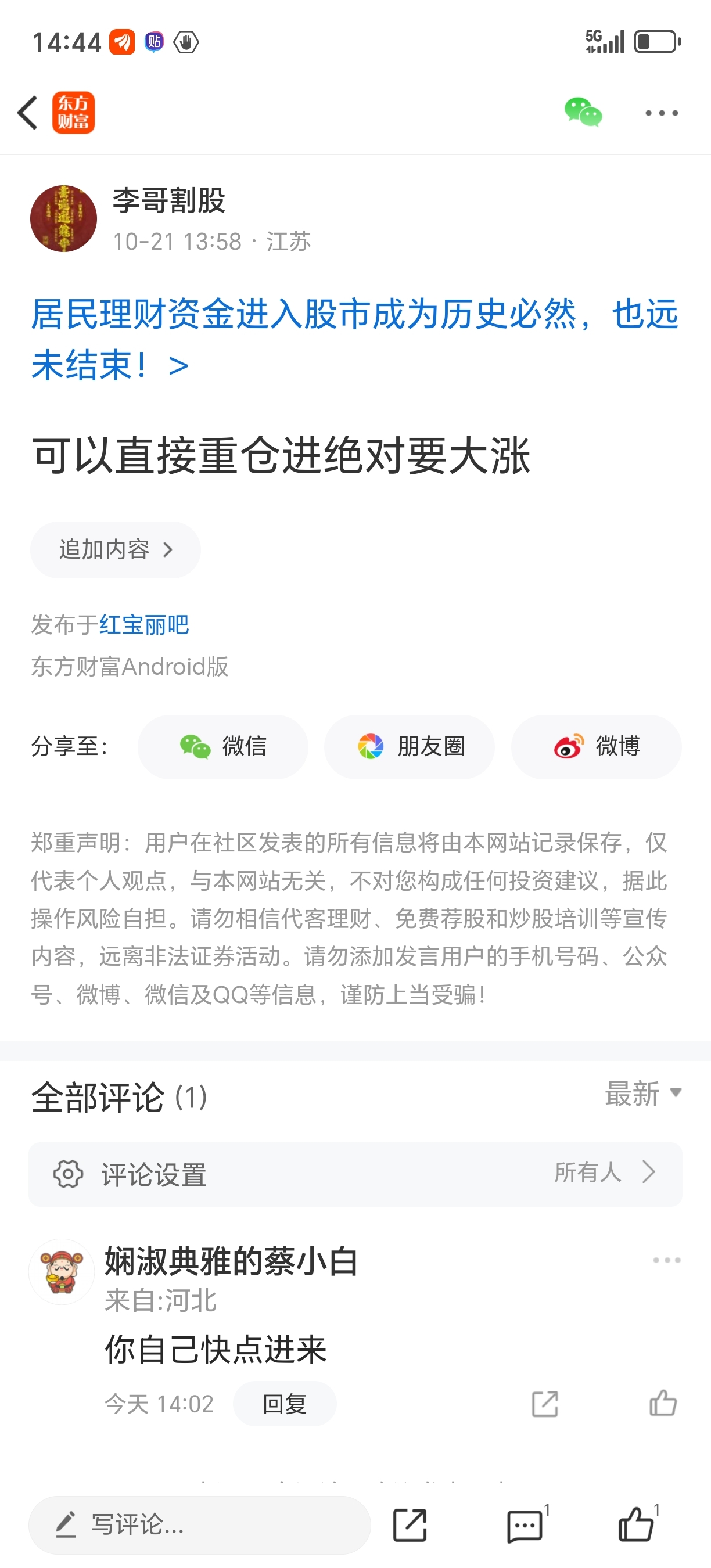 温馨提示: 1.根据《证券法》规定,禁止编造、传播虚假信息或者误导性信息,扰乱证券市场;2.用户在本社区发表的所有资料、言论等仅代表个人观点,与本网站立场无关,不对您构成任何投资建议。用户应基于自己的独立判断,自行决定证券投资并承担相应风险。《东方财富社区管理规定》