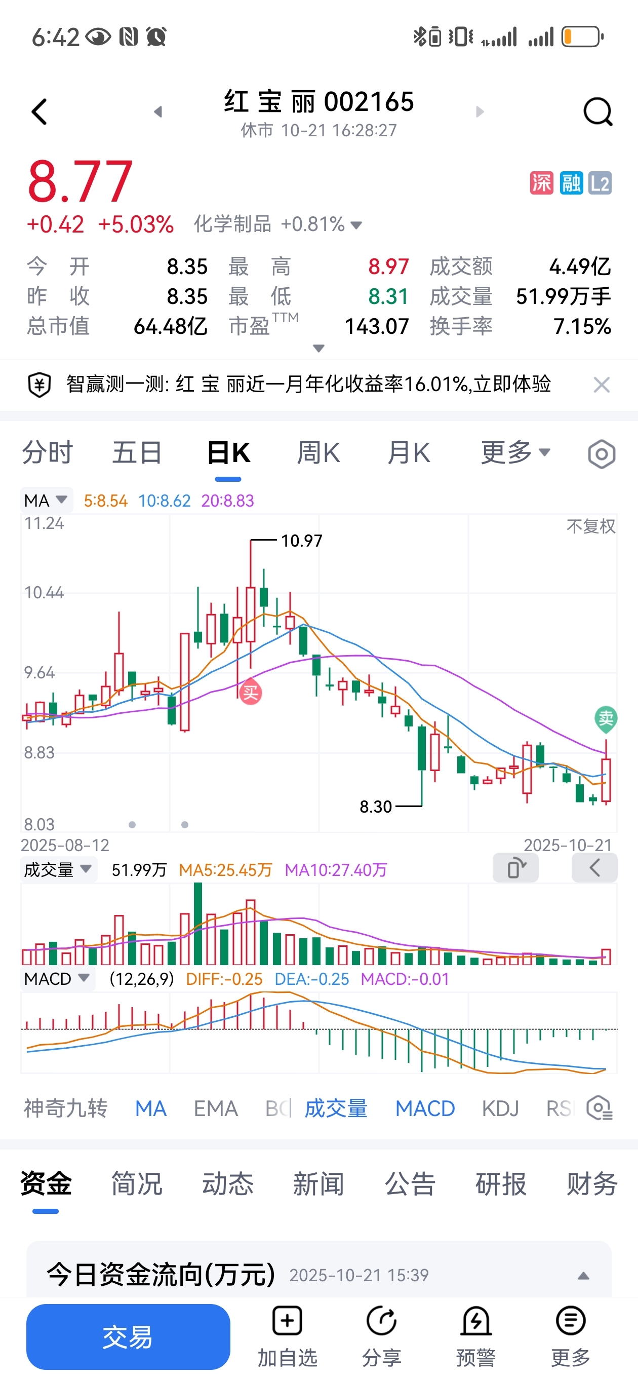 这一波下跌吃了满满的,10.75全仓买一直没动,今天8.36受不了全仓卖了,去了